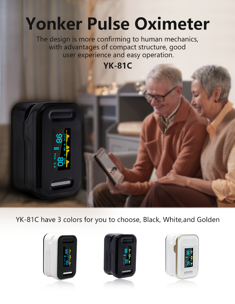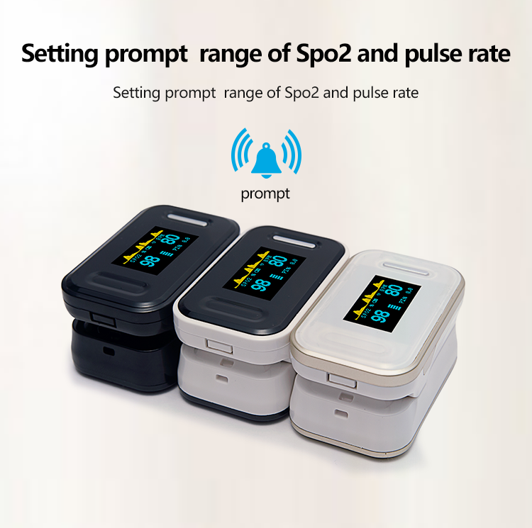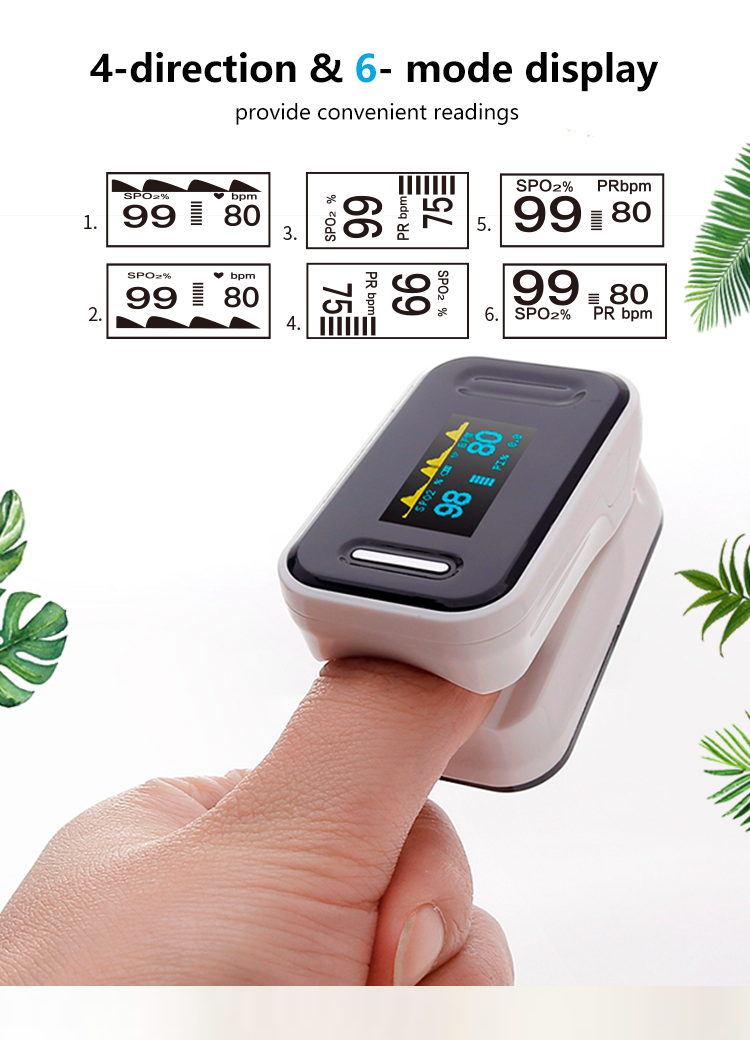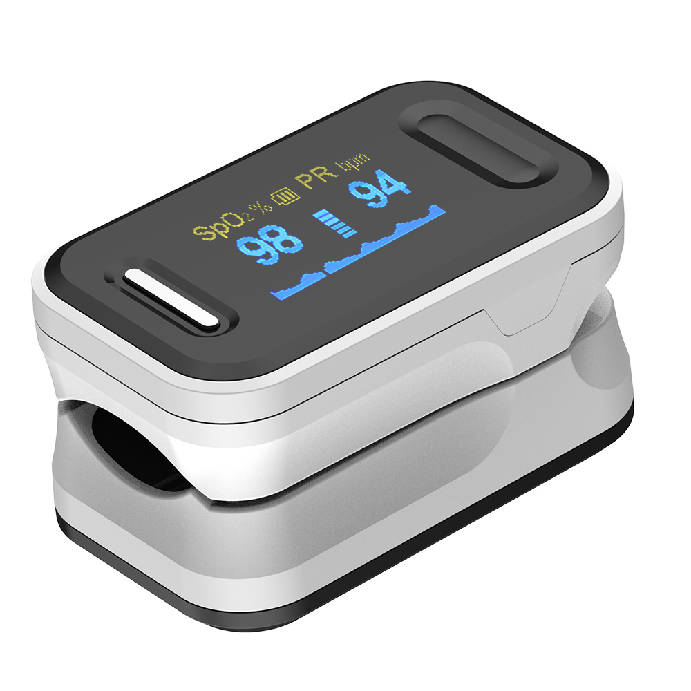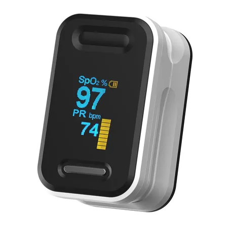Dual color OLED displays SpO2, PR, waveform, Pulse bar;