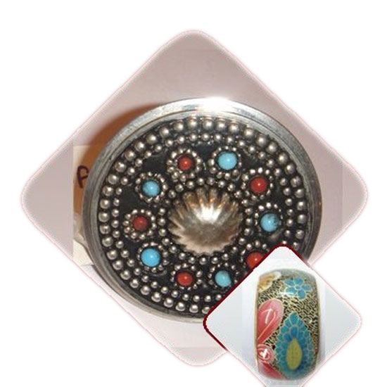 The beautiful ring here features a round-shape adornment. The metal adornment is adorned with metal beads and resin in sharp blue and red. A vintage accent is added to the surface to show extra glamor.