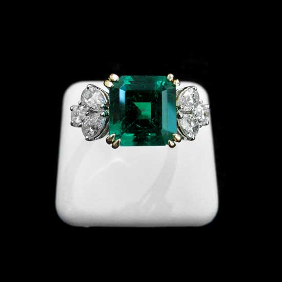 This finger ring features a big emerald stone with a brilliant square cut and high transparency. Complemented several white diamonds, this ring looks like an exquisite flower. With excellent craftsmanship, this ring surely is an excellent addition to your fine jewelry collection.