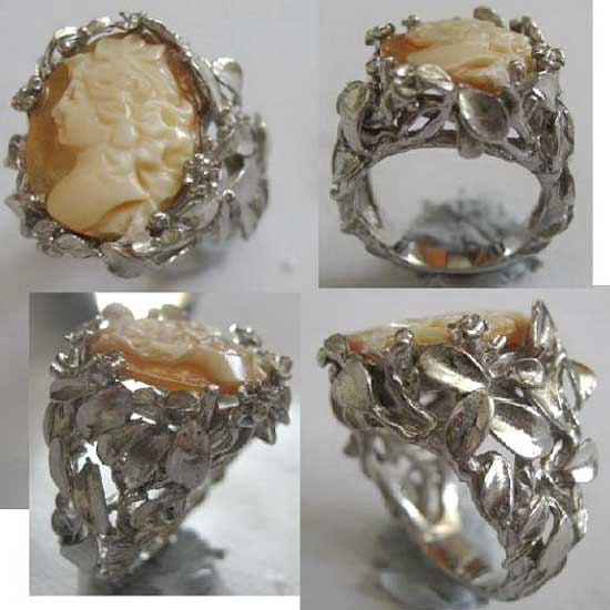 This finger ring appeals to people with its sophisticated and artistic design. Its mounting is made of sterling 925 silver and crafted with vivid floral decorations. The centerpiece is a shell cameo which is a Victorian lady look.