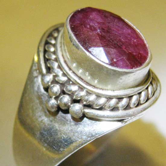 This finger ring boasts a classic and elegant design. It features a silver mounting with embossed patterns. This ring is inlaid with a natural ruby stone on top in a round shape.