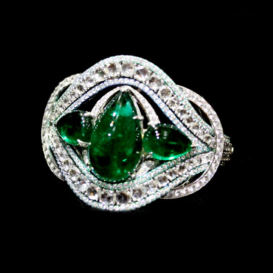 This finger ring comes with an attractive and sparkling appearance. It features a sophisticated mounting with alluring emerald stones. The shimmering diamonds accent this design for added luxuriousness.