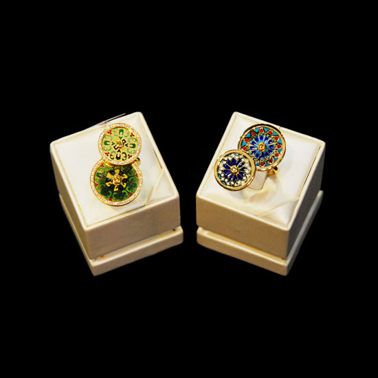This series of 18-carat gold finger rings features two geometric enamel coins that overlap like an Arabic number eight. The edge of the ring is either diamond-embellished or gold polished for an elegant touch. The enamel ring easily matches both formal and casual outfits.