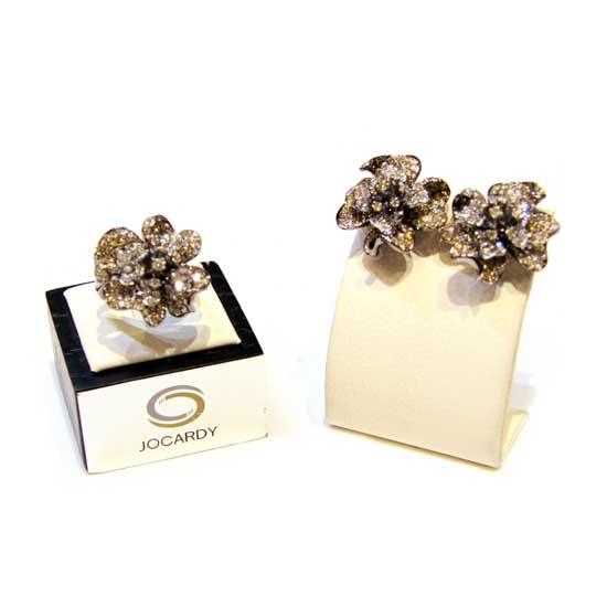 These finger ring and earrings flaunt a flower shaped design for a feminine touch. The sparkling diamonds are finely encrusted on the surface to complement the design. These irresistible finger ring and earrings are ideal for modern ladies.
