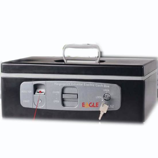 This is a fingerprint inductor electric cash box in a handsome black finish. The cash box can be either opened by a fingerprint or a key. Records are stored in non-volatile memory, meaning that the chip can retain data even after it is shut off.