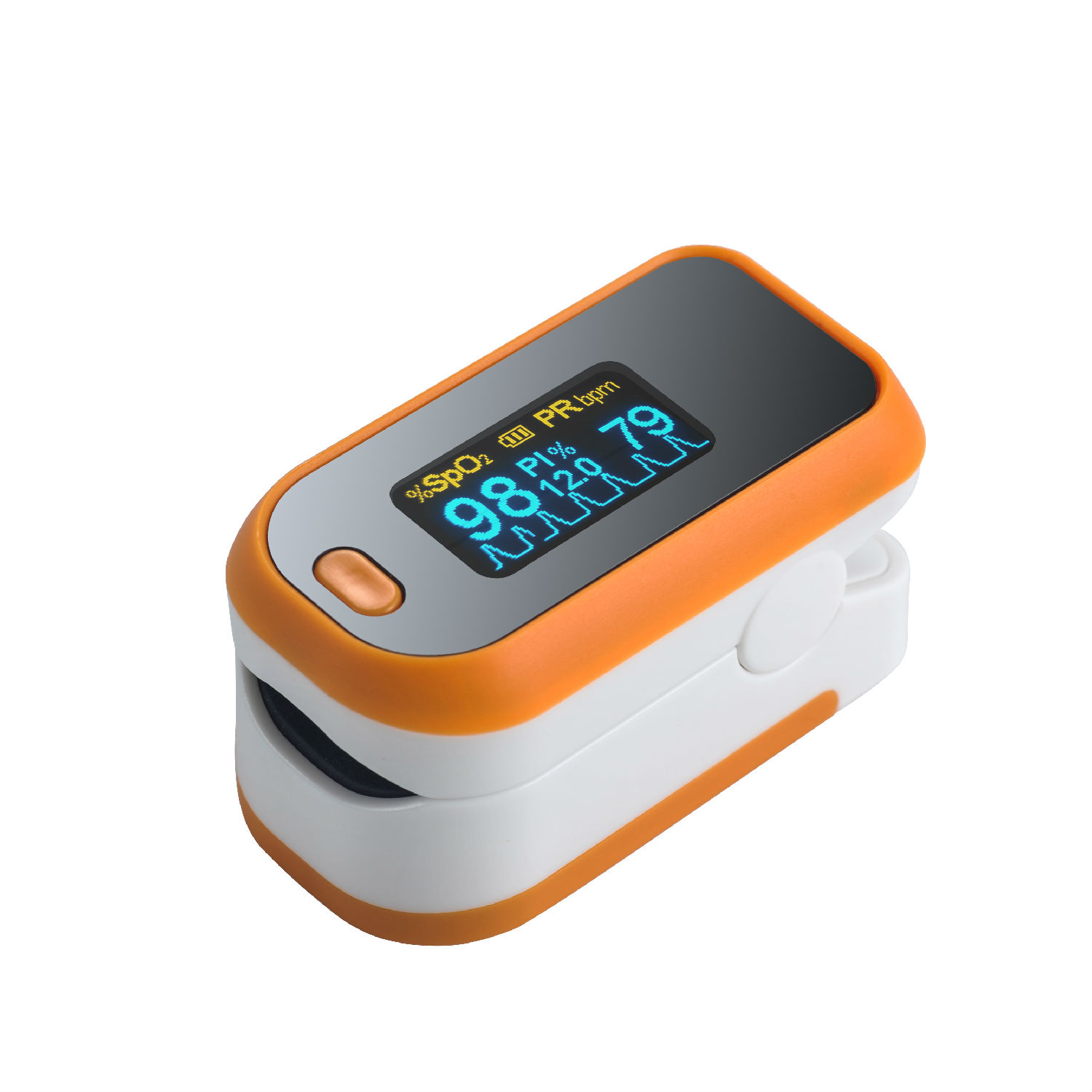 • Two-color OLED Display SpO2, SpO2 waveform, Pulse rate, Pulse bar, and Perfusion index