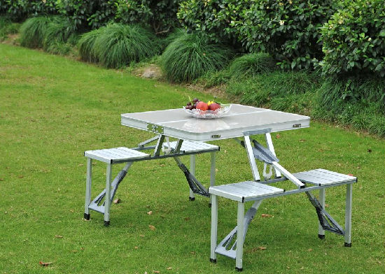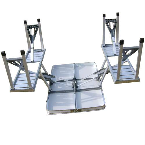 • Fir wood table and bench natural color half aluminum, half steel structure.