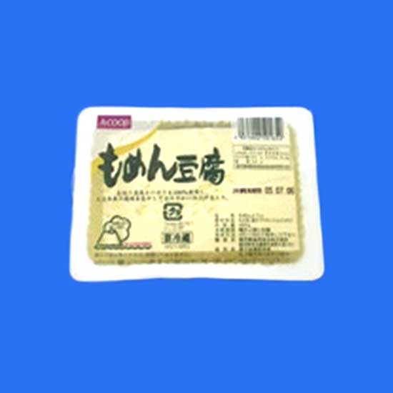 Displayed is a pack of firm tofu, or momen tofu in Japanese. With a special treatment, this tofu still contains a great amount of moisture, which makes it bouncy when pressed. This tofu is produced without antifoaming agent for your assurance.