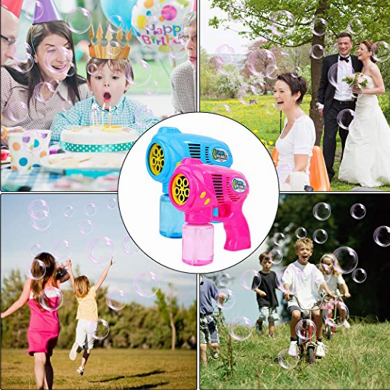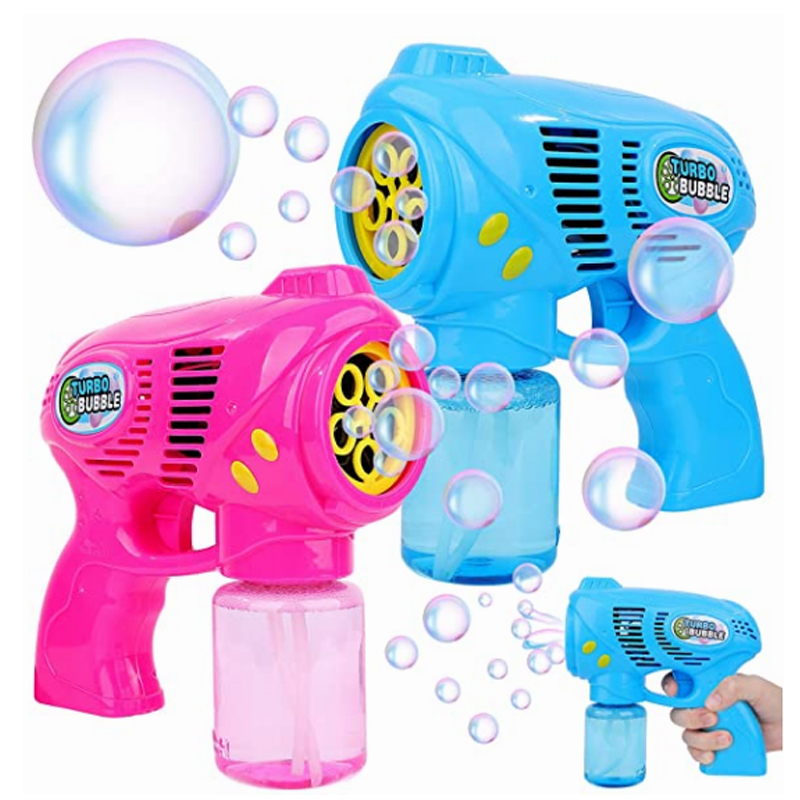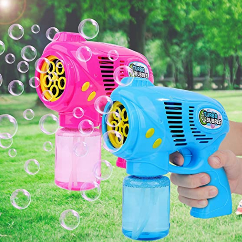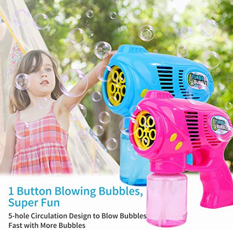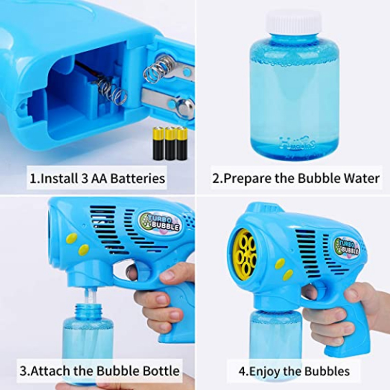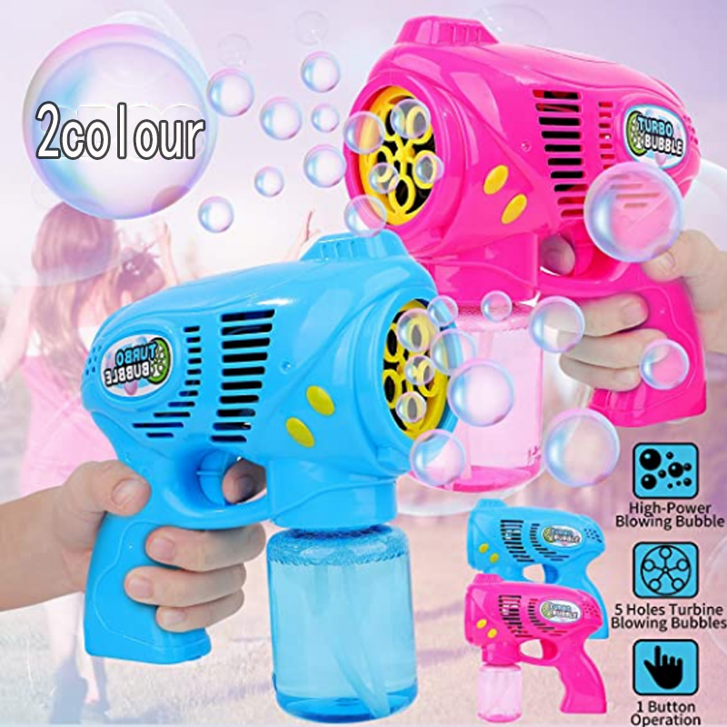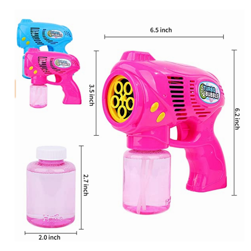1.This bubble gun has two colour in blue and pink, and paired with bubble water. Not including 2*AA battery ,you can prepare in advance.