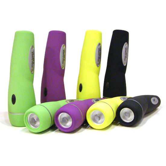 This is a series of thermoplastic rubber flashlight of different sizes. The thermoplastic rubber housing allows comfortable and firm grip. It is operated by AA sized battery.