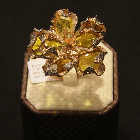 This ring is made of 18k pink gold with yellow flat diamonds. It flaunts a floral shape to add a decorative touch. The ring is an ideal accessory for ladies.