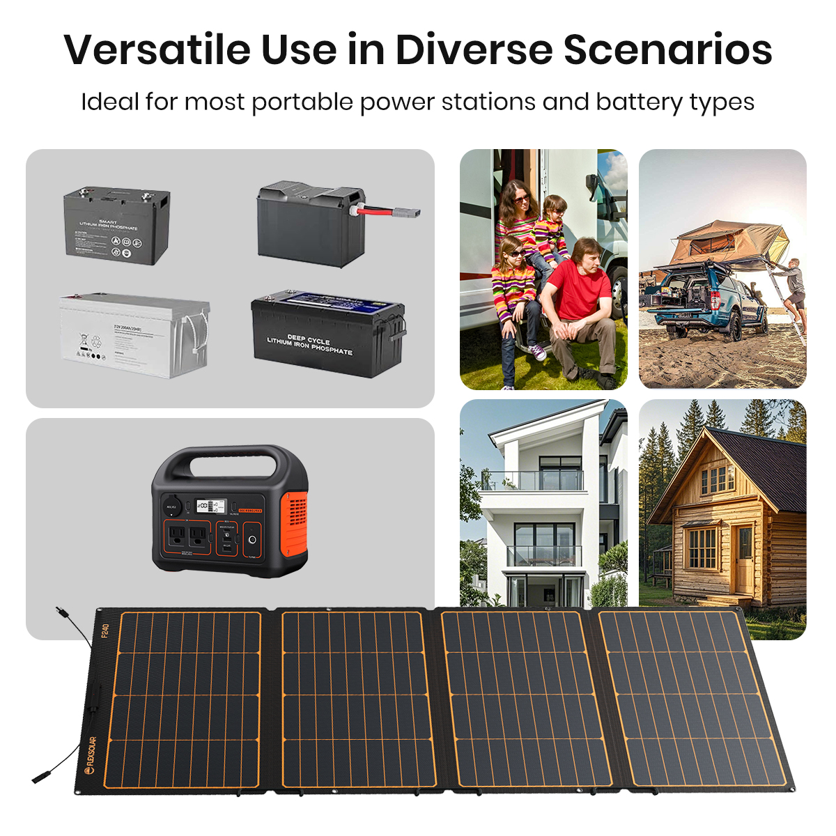 Made for camping and off-grid adventures, the 120W foldable solar panel kit is ideal for long-time trips when you need to different kinds of batteries with optimized solar charging.