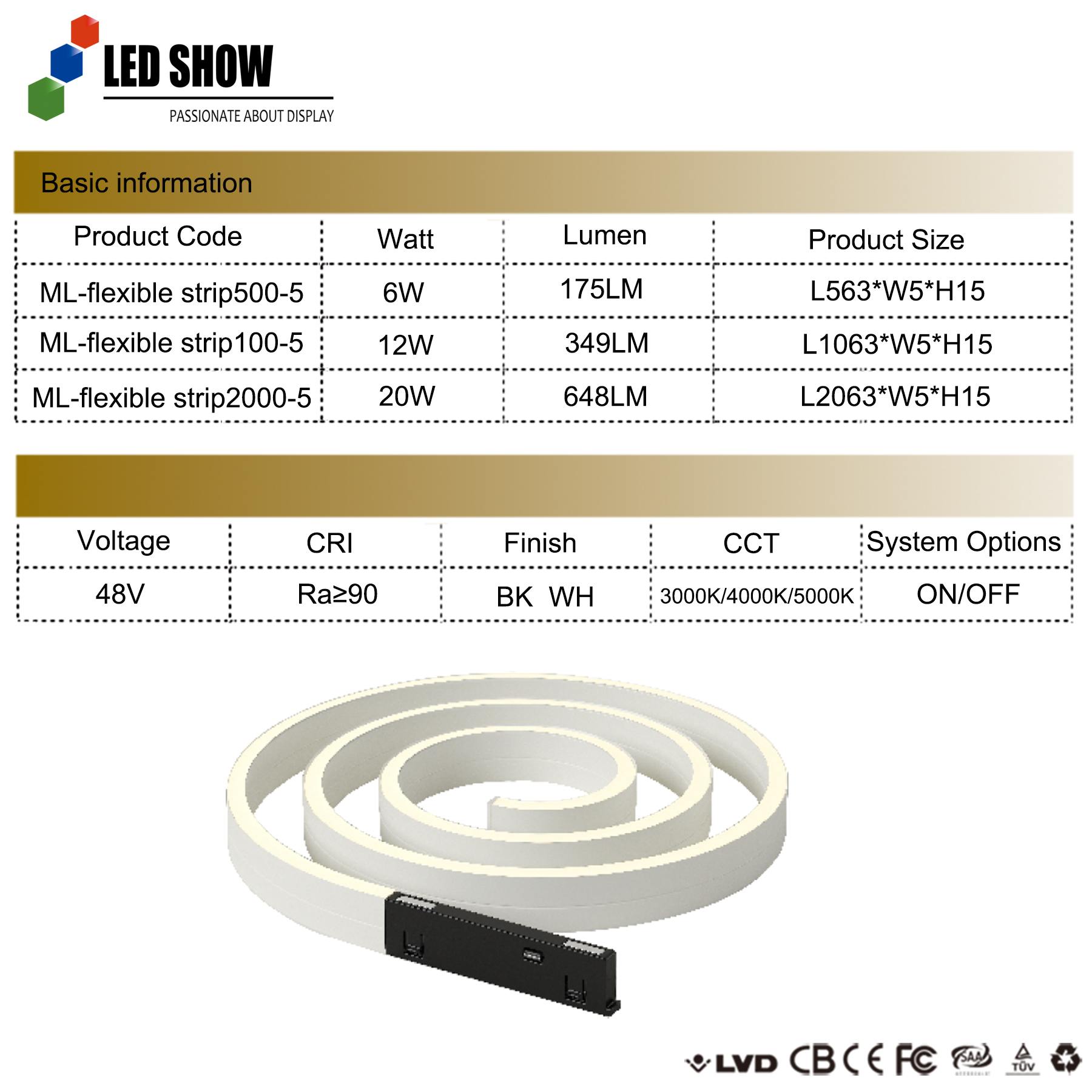 The ML-flexible Series Adjustable Track Light Strip is designed for modern commercial lighting applications, offering three standard length options—500mm, 1000mm, and 2000mm—to meet various spatial layout requirements. Featuring high color rendering LED light sources and a 100° wide beam angle, this series ensures even, soft illumination that enhances product display and visual comfort. The 48V safe low-voltage power supply system guarantees installation and operational safety, while compliance with international LVD and CBCE certifications makes it suitable for a wide range of commercial environments.