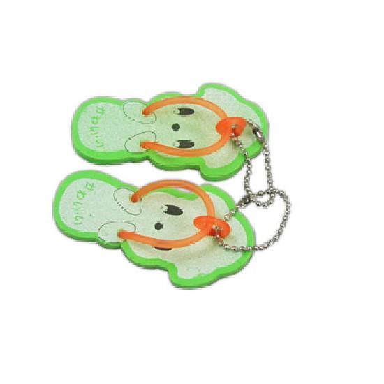 Looking for something cute to add to your zipper pull? Featured here is a foam key ring which comes in the shape of a pair of flip flops. The Y-shaped strap is in bright orange color while the sole which comes in green color is completed with the print of a puppy. The pair is attached together with silver-plated ball chain with connector. This keychain is available in different materials and colors. Custom design is also welcome on request.