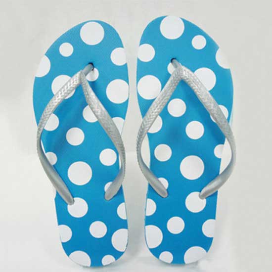 Featured here is a pair of flip flops designed for young ladies. The flip flops are made of quality materials for a good structure and durability. The blue-and-white polka dots add a touch of style for the flip flops.
