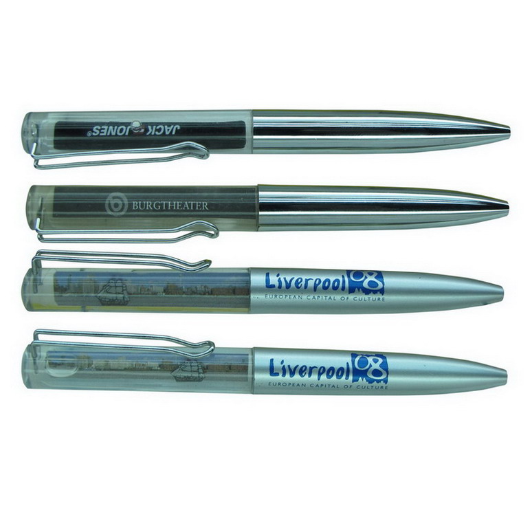 Company logos can be explicitly embedded in the upper liquid barrel. Various floaters can be selected for your favor. With the slender clip, users can conveniently clip the ball pen hang it on their shirt front pockets or journals.