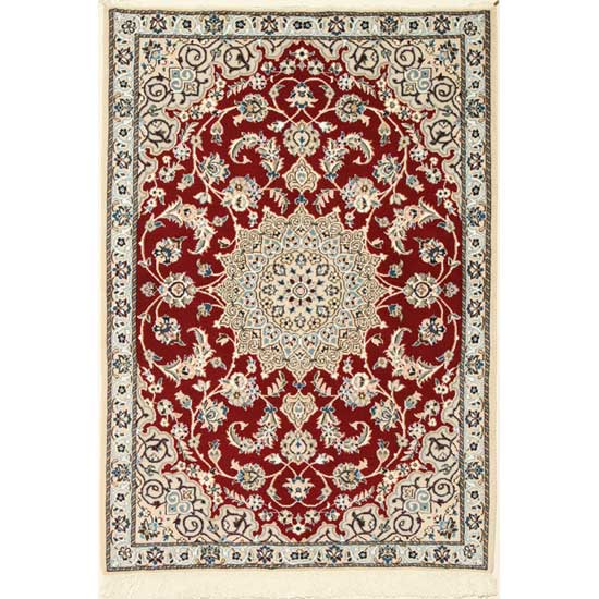 Displayed here is a floor-covering carpet in red and beige colors. The fine finishing promises long-lasting beauty. It is crafted with wool and silk for a touch of luxury.