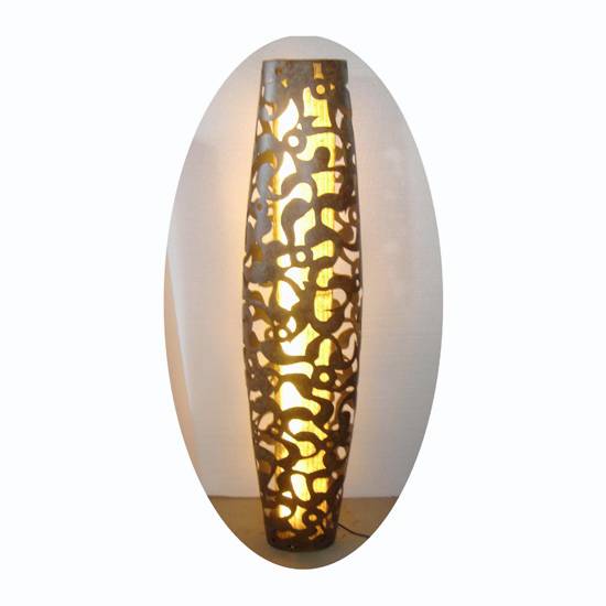 This floor lamp has a rusty finishing in orange abaca. It has a unique design with a slight vertical oval shape. Moderate light emitted from the lamp patterns adds character to the light. It gives people a warm feeling.