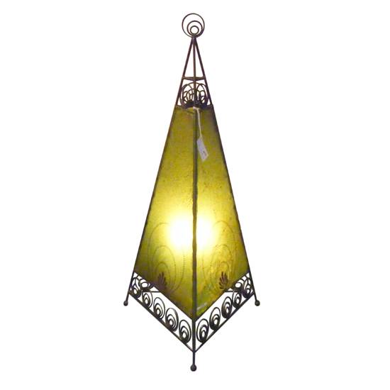 This is a decorative floor lamp featuring with a leather shading. The floor lamp has a special cone shape. The Indian style metal frame adds variation and decoration to the floor lamp, giving it a exotic style. The soft and mild light emits from the lamp makes people feeling relaxing and comforting.