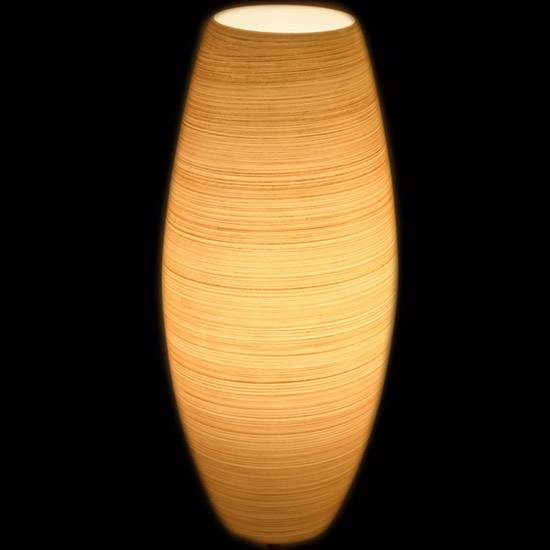 The design of this floor lamp is very simple but modern. The lamp features a long, curved lampshade with wooden patterns on it. With the lighting effect, the lamp not only gives out a warm and harmonious feeling, but also fills the room with an air of nature.