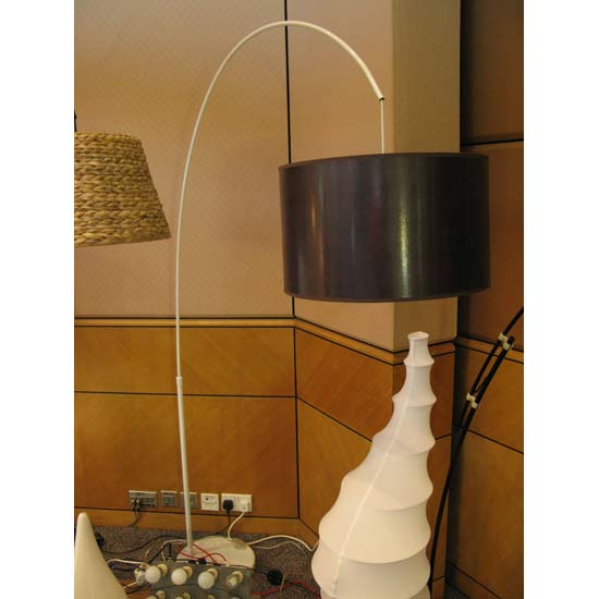Highlighted is a floor lamp with a cylindrical shade made of snakeskin. It features a long slim pole. Decorate your space with this unique floor lamp.