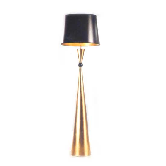This floor lamp is made with a tapering metal cylinder base in a highly golden-tone finish. The light beams from the black lampshade are soft and well-distributed for illuminating your living room. It has an exquisite and charming look, ideal for home, hotel, office and many kinds of rooms.