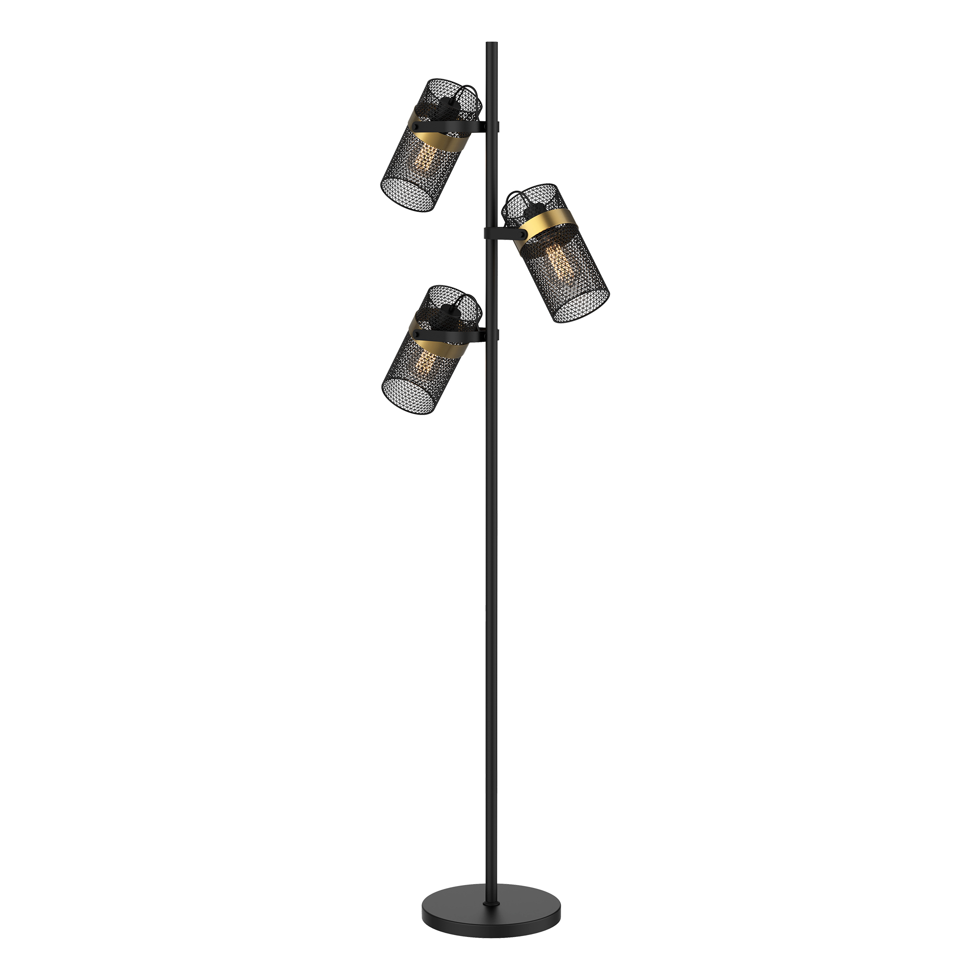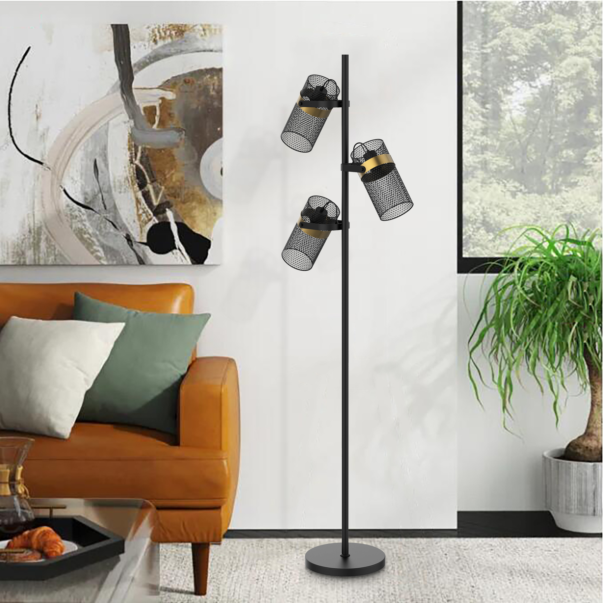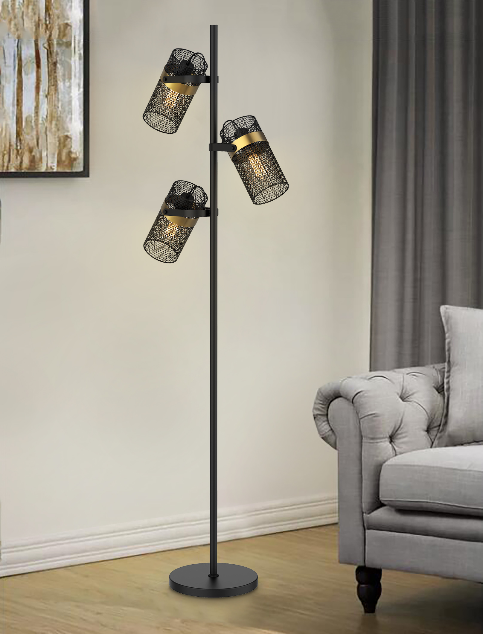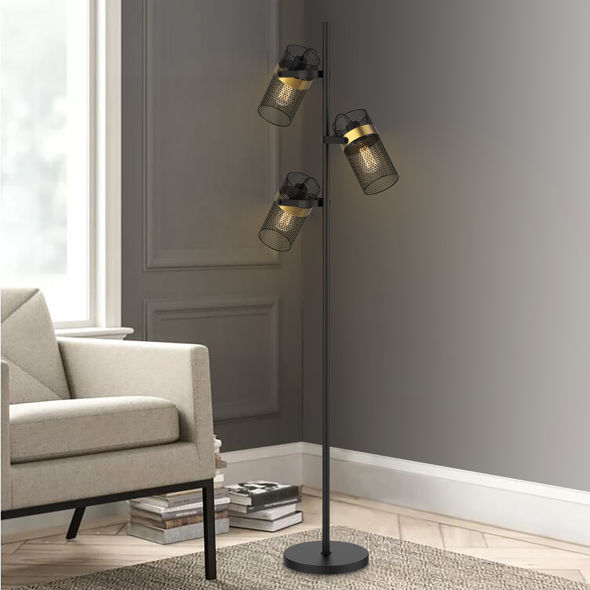 Slim & sophisticated floor lamp ,Three black metal cages around bulbs ,Perfect accent lighting for living room