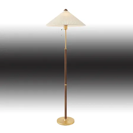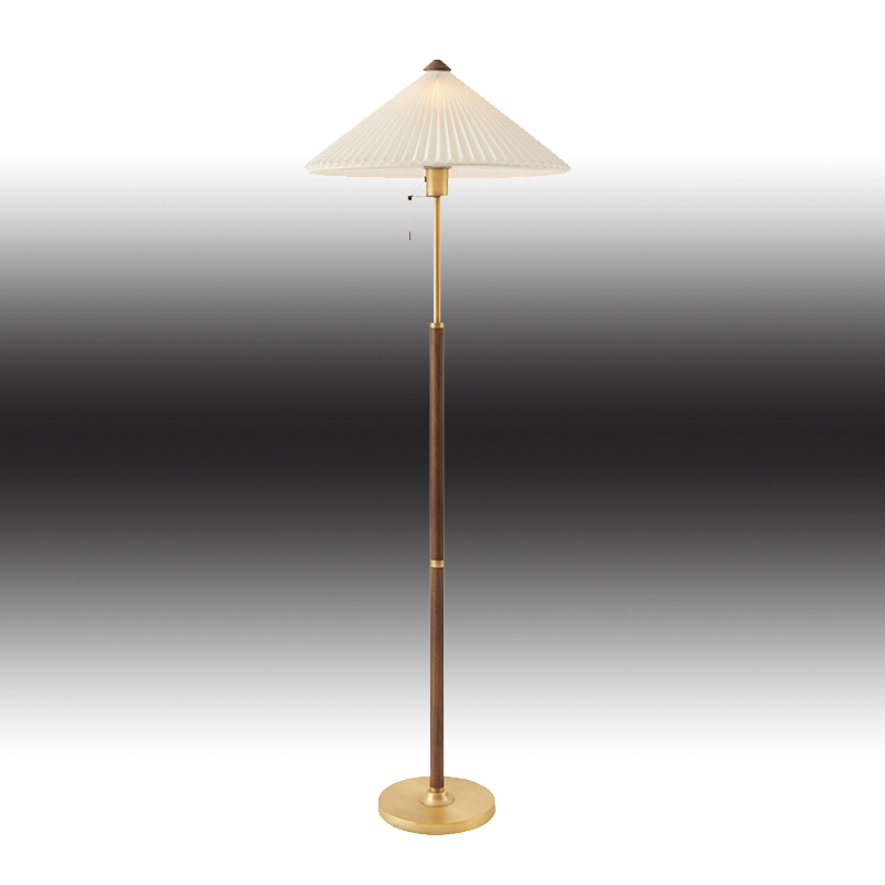 metal in brass via e-plating, ash in dark brown color, pleated linen shade in nature color