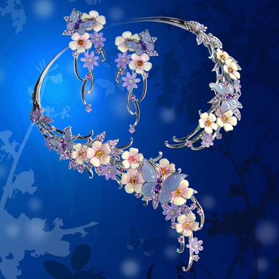 This is an extravagant set of color enamel jewelry designed in the flower and floral flavor called "sweet paradise". The floral necklace and earrings are filled with colorful flowers in pink and purple with purple butterflies. The elegant enamel set is good for beautiful ladies in semi-formal events.