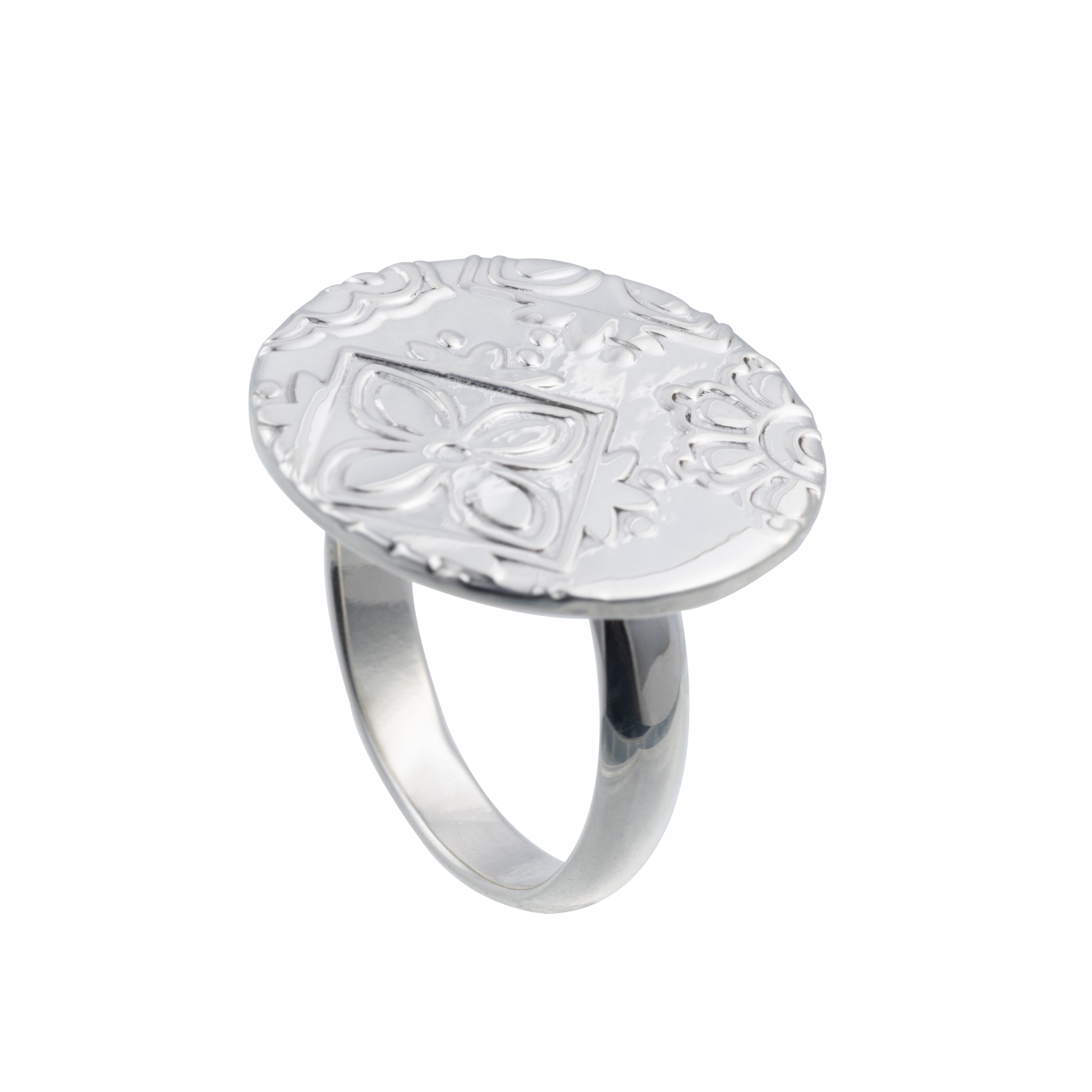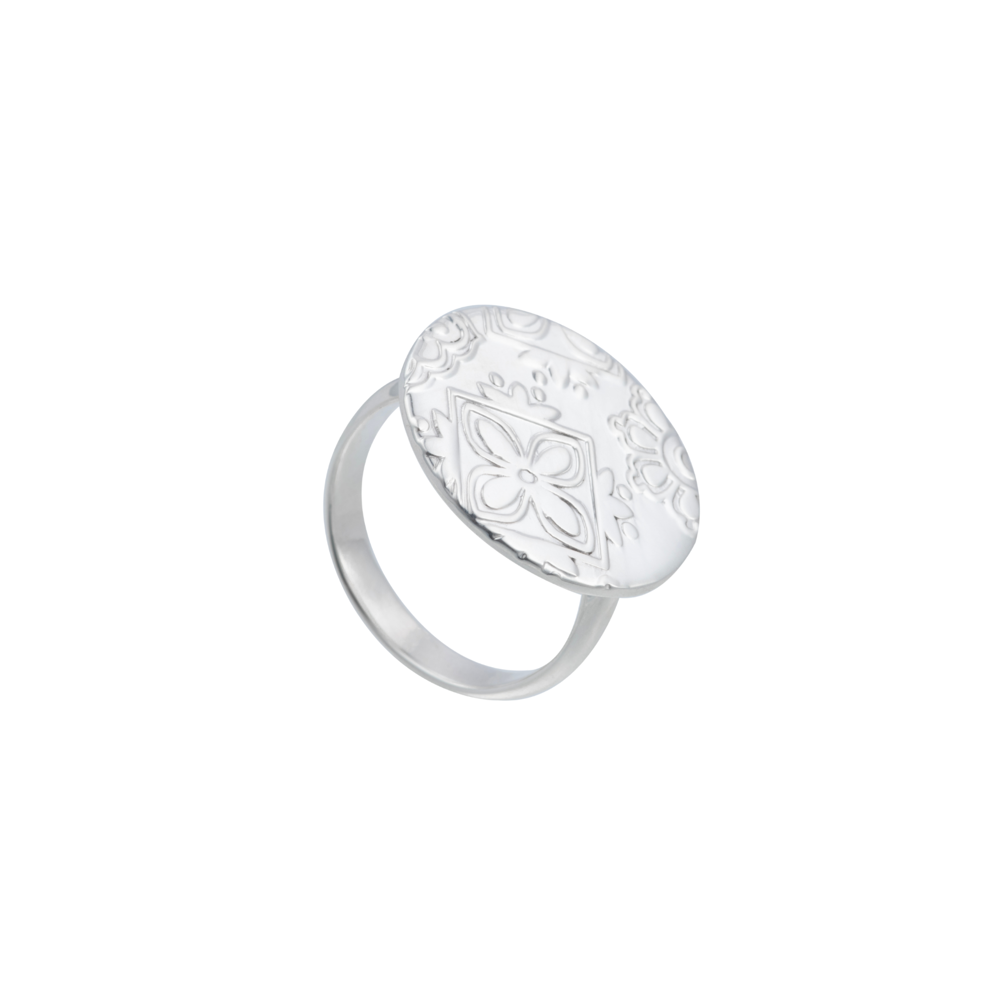 The round flower tapestry ring is a piece that captures the essence of nature through its meticulous engraved design. Its raised round surface highlights a detailed floral pattern, evoking the harmony and balance of ancient handcrafted tapestries.