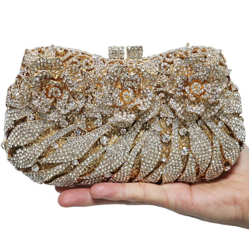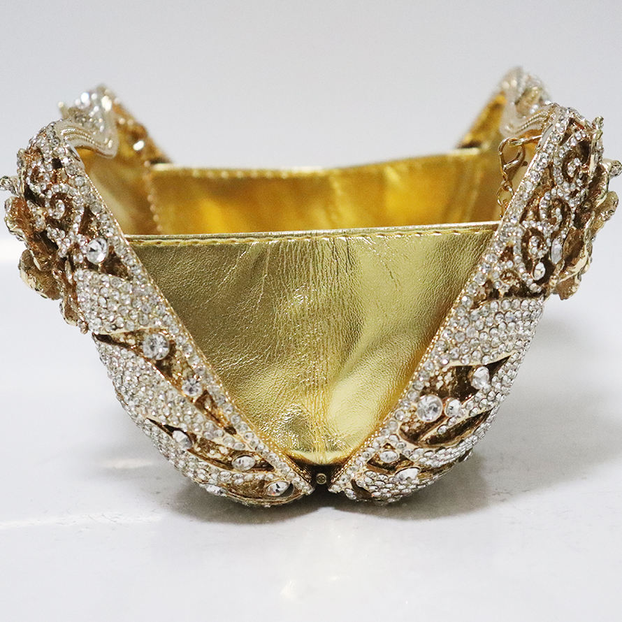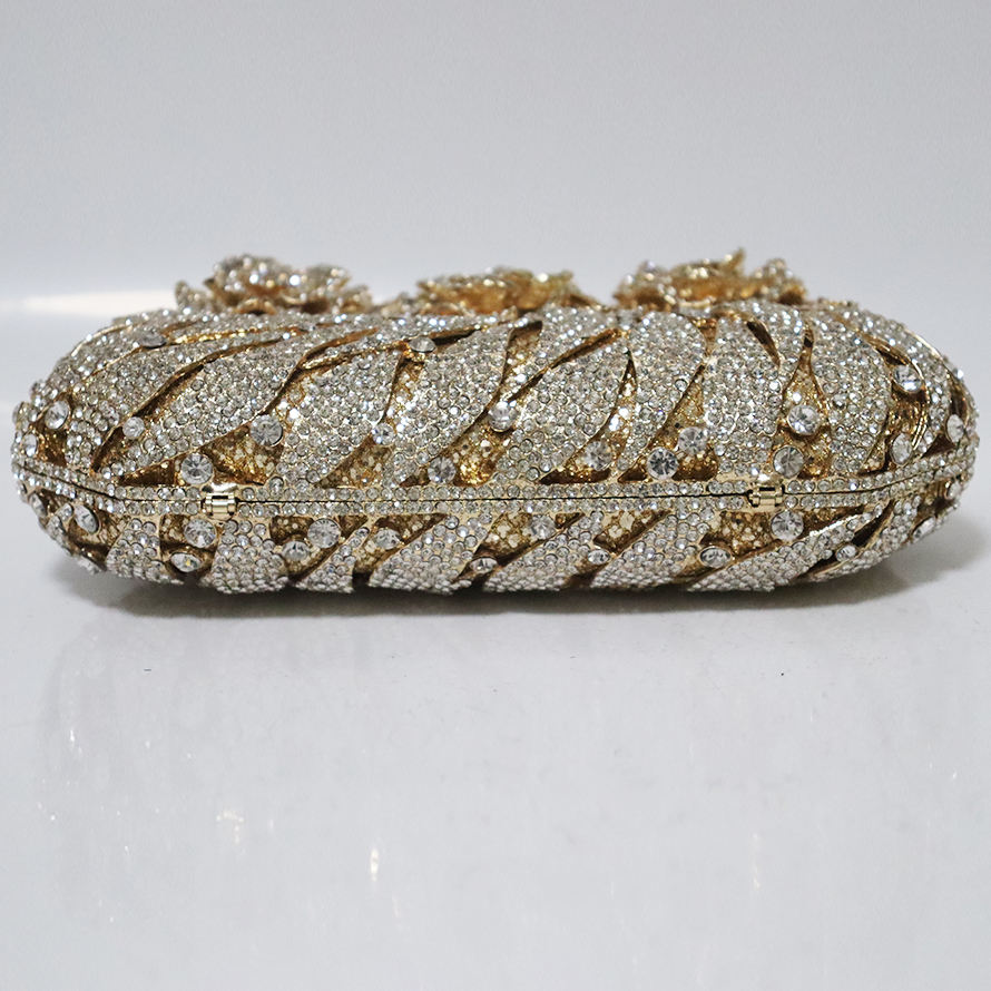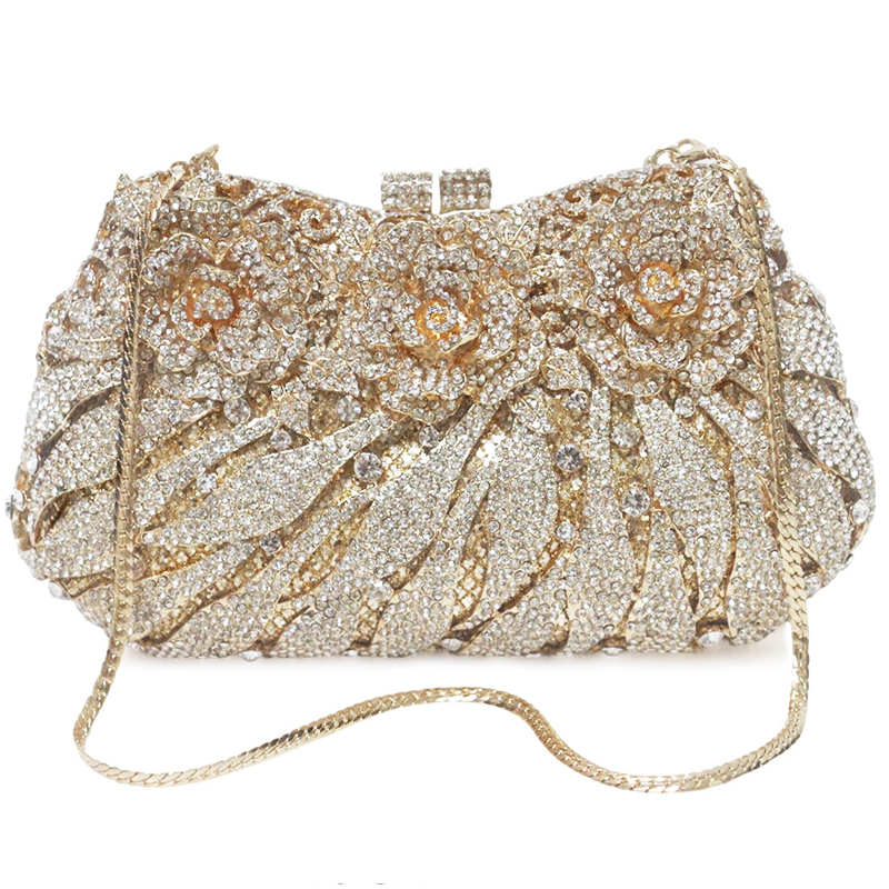 Elegant gold crystal clutch purse designed for fashion brands targeting wedding and party markets.