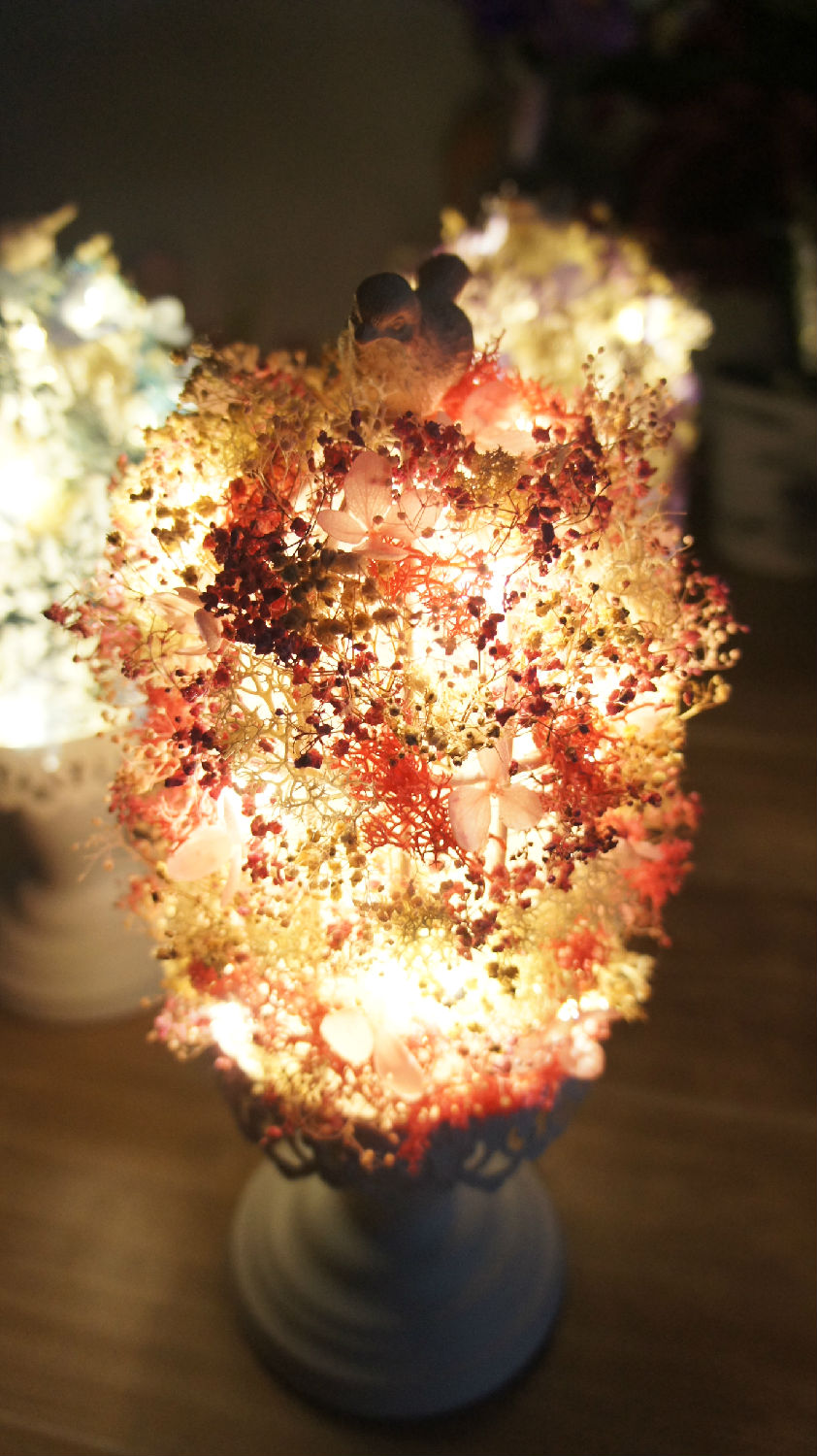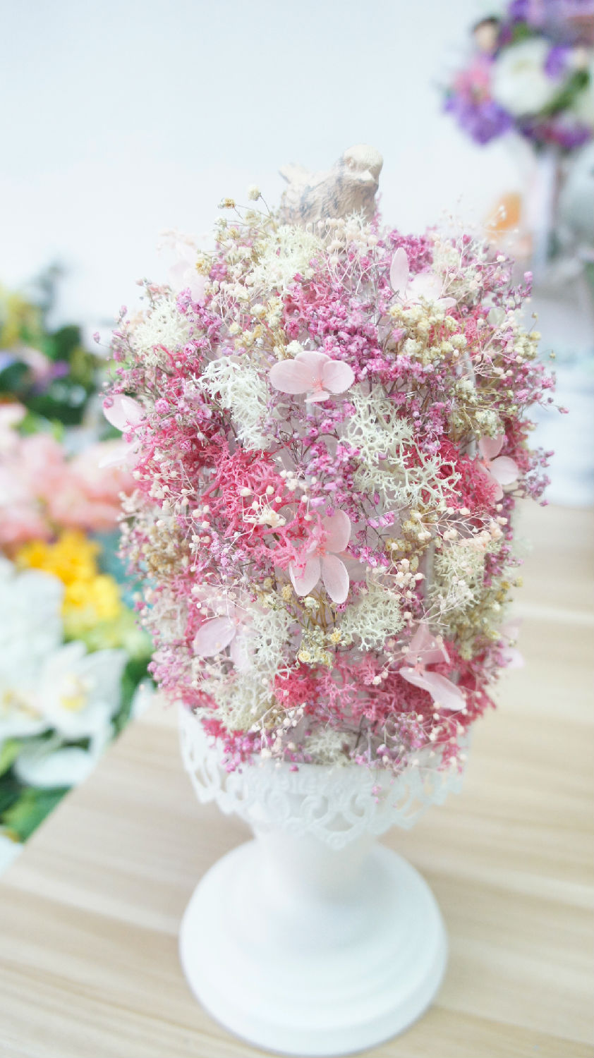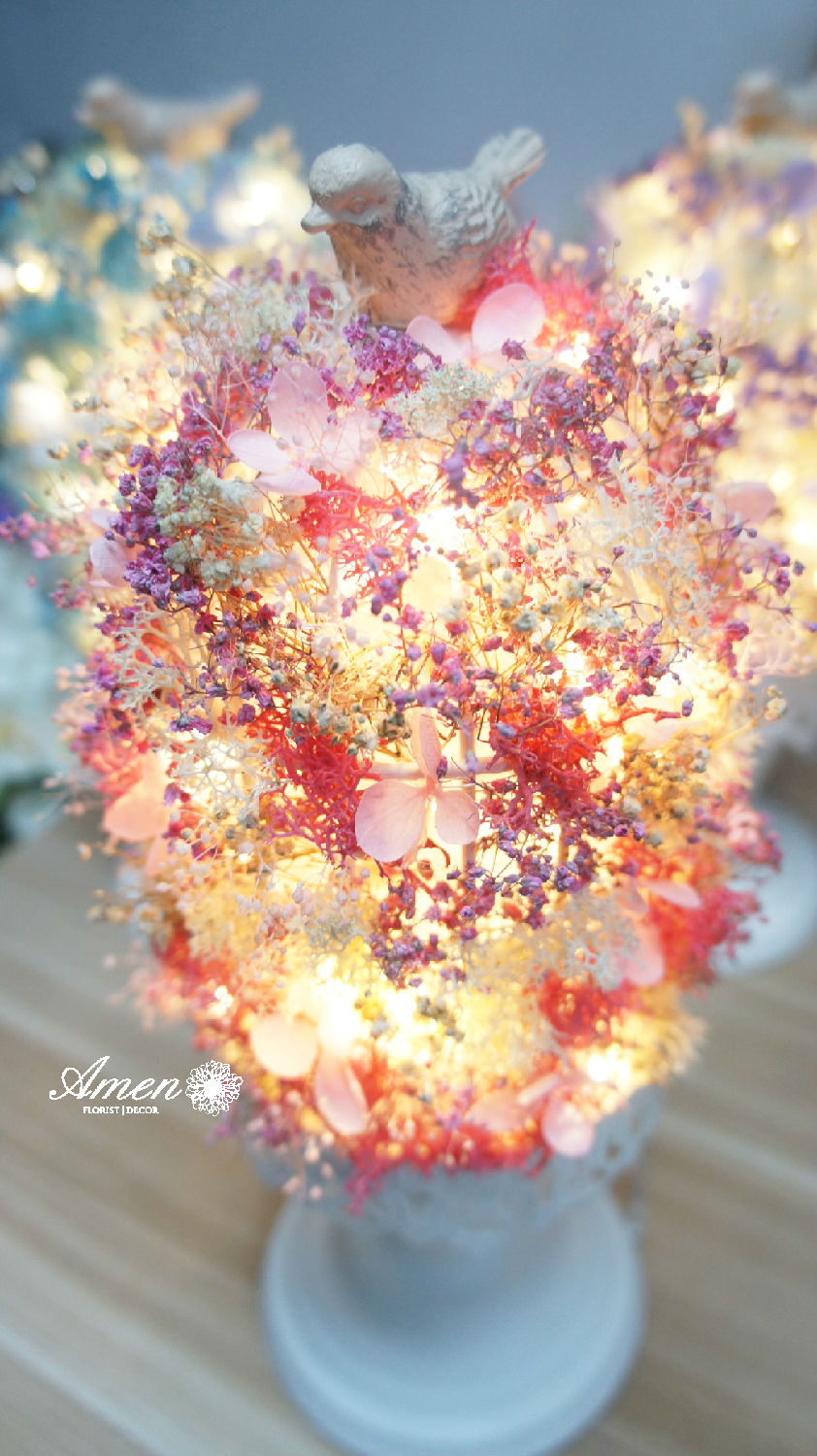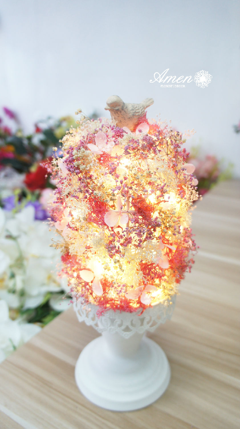 The colorful preserved flowers are in bloom in a well designed LED birdcage table lamp.