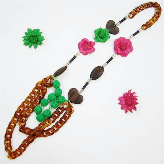 This funky necklace radiates a summery appeal with its cheerful flower-shaped accents and vivid dangling charms. Brown curb chains lend a casual air to this beautiful necklace. The chunky mid-length design goes wonderfully well with plain and simple tops.