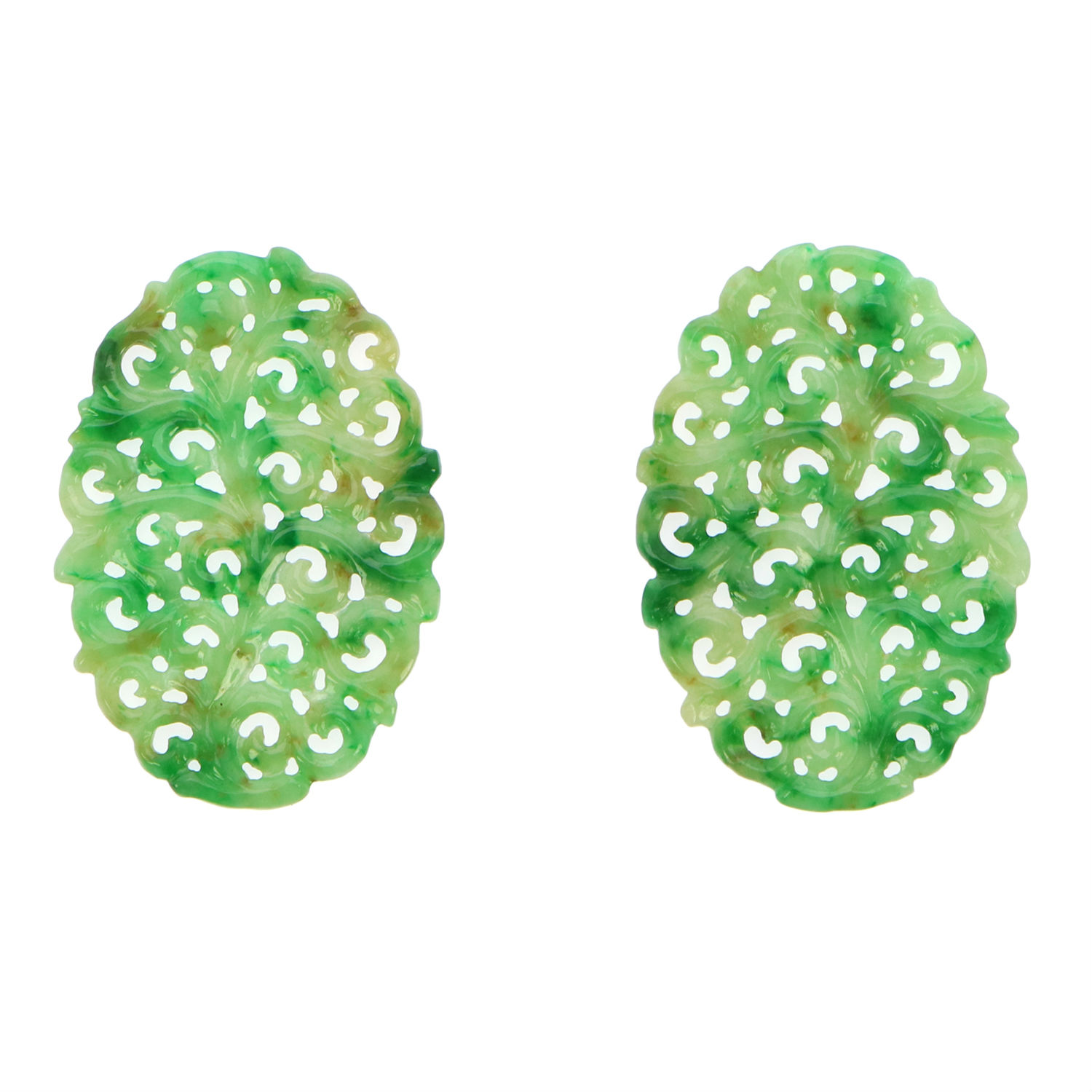 Handcrafted from natural green jadeite jade, this pair of earrings is forged to an oval shape filled with floral cut-outs for an exotic and antique look. The refined pair also delivers various sharp and bright hues that would surely capture everyone’s attention. Team this exquisite pair with a green gown and strappy heels for an ethereal and timeless evening look.