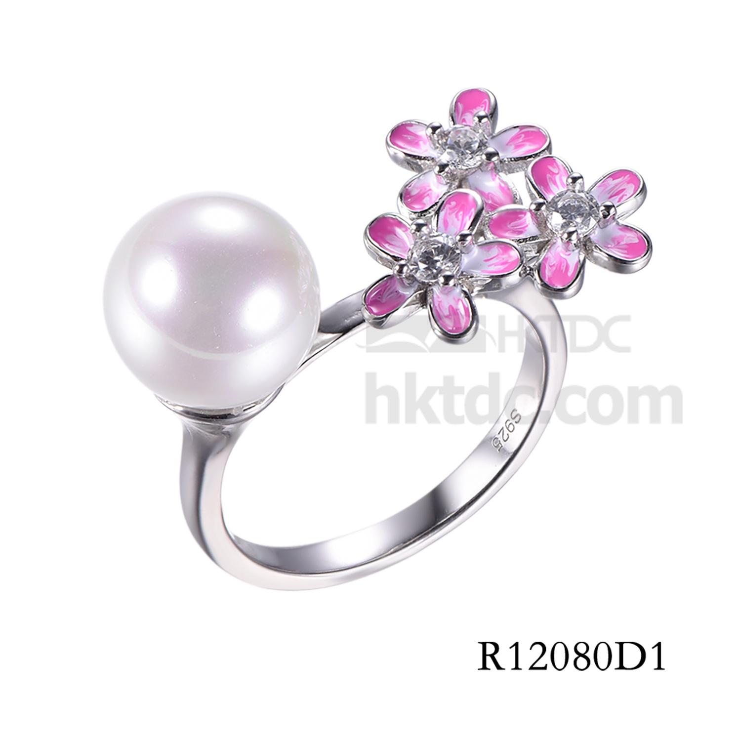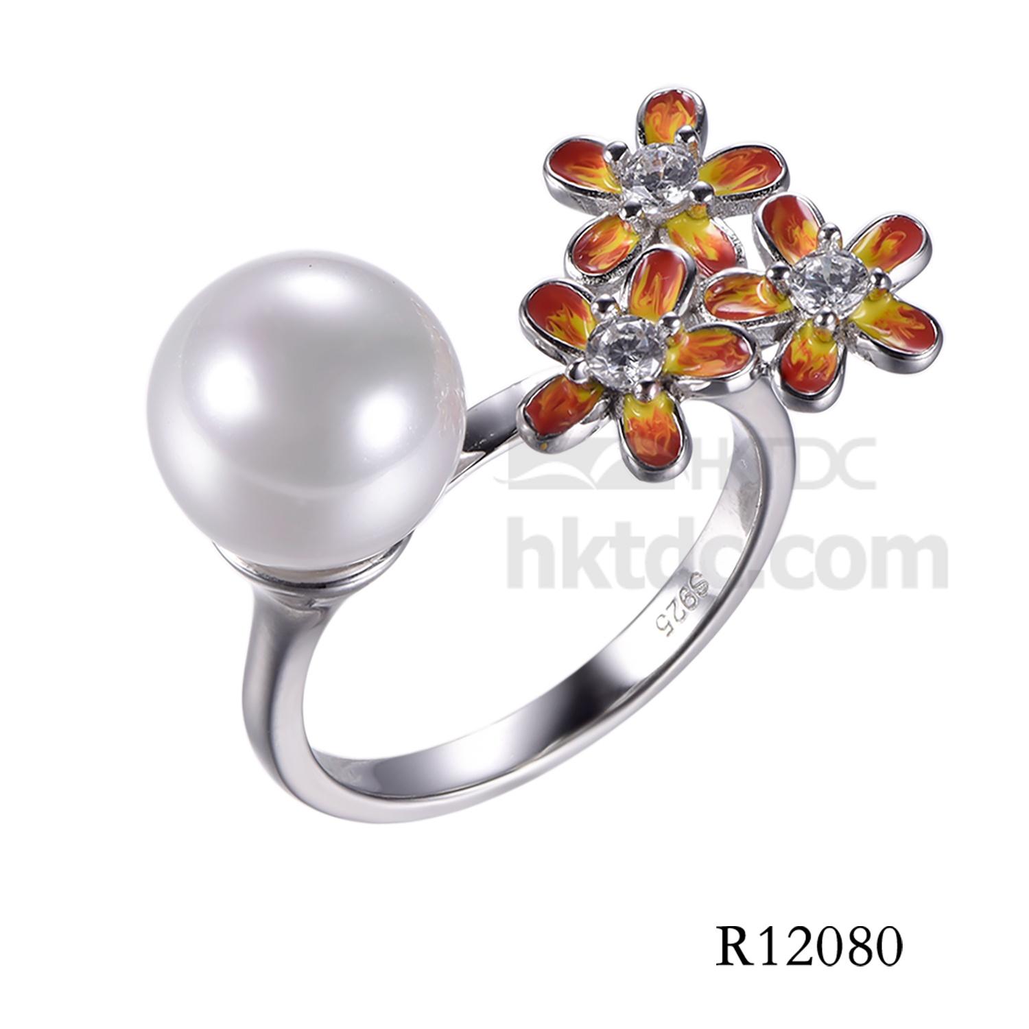 Flower Enamel and Pearl Ring Sterling Silver Jewelry