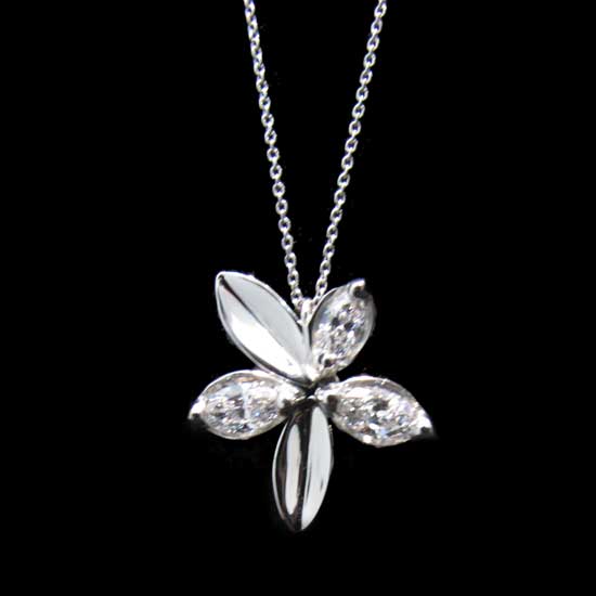 This dainty necklace features a polished platinum pendant in an olive flower design. The three marquise-cut diamonds add more charm and beauty to the piece. The cable chain completes the design of the necklace.