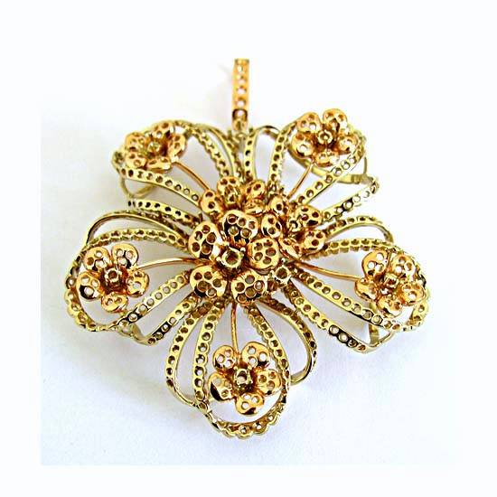 The golden pendant boasts a flower design with punched hole styling. It is uniquely designed with a sense of artistic flair. Add style to your look with this flower pendant.