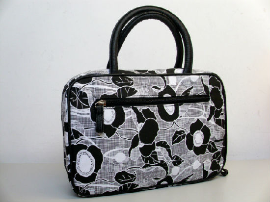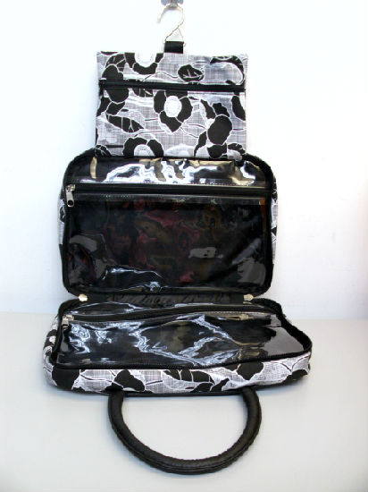 • Inside have two of clear PVC zippered pocket, one of flower printed cotton zipper pocket and one metal hook hanger.