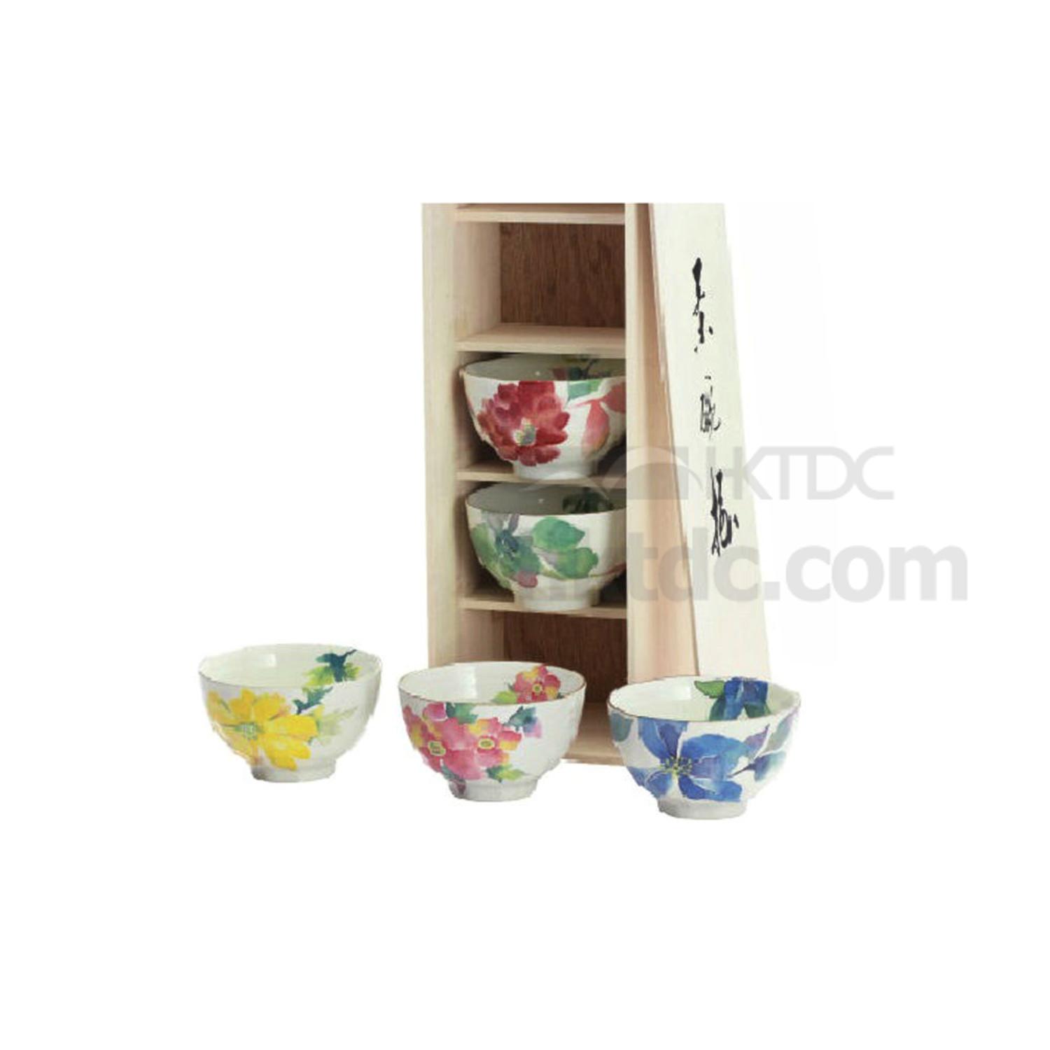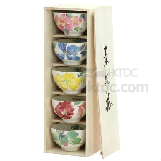 Presented is a five-piece bowl set compartmented in a refined wooden box, giving a brilliant idea for a housewarming gift. Constructed from high-quality porcelain, each bowl is finished in white featuring a blooming watercolor flower in different shades that ensures a unique-yet-consistent design.
