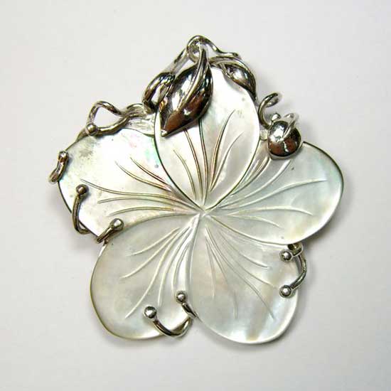 This elegant pendant features a blossoming flower with five petals, which is clutched by climbing veins from the back. The flower pendant is finely polished to give a shiny silvery finish, which glows in implicit radiance as a springtime bloom.