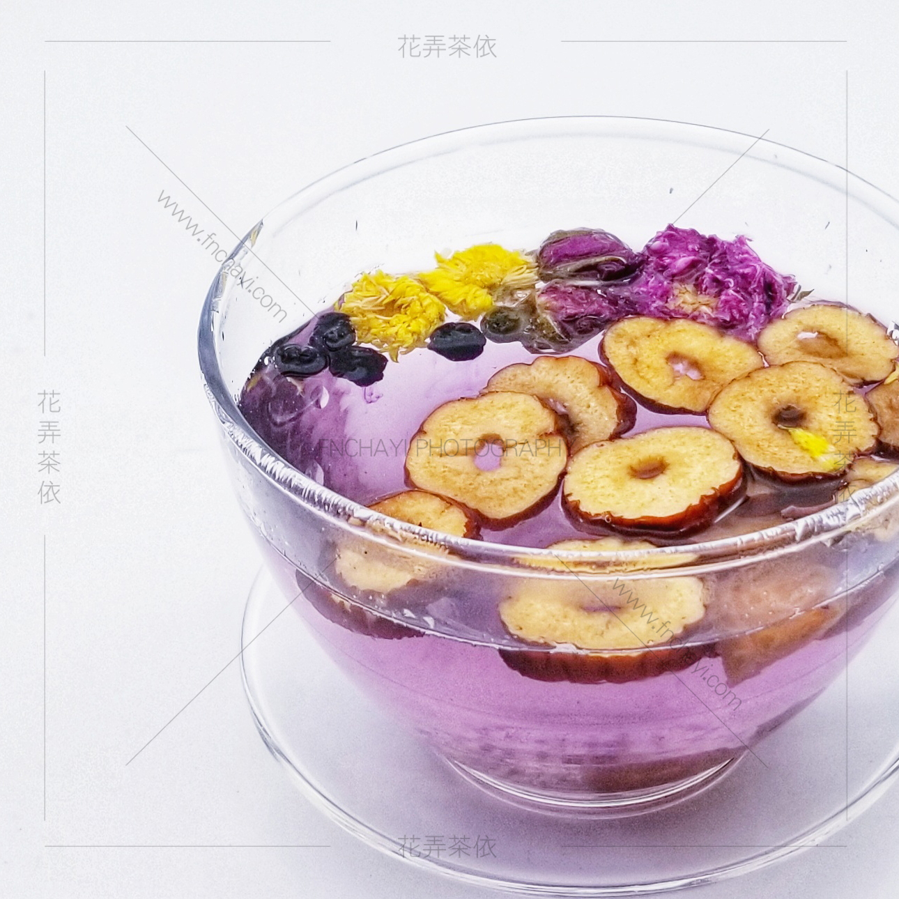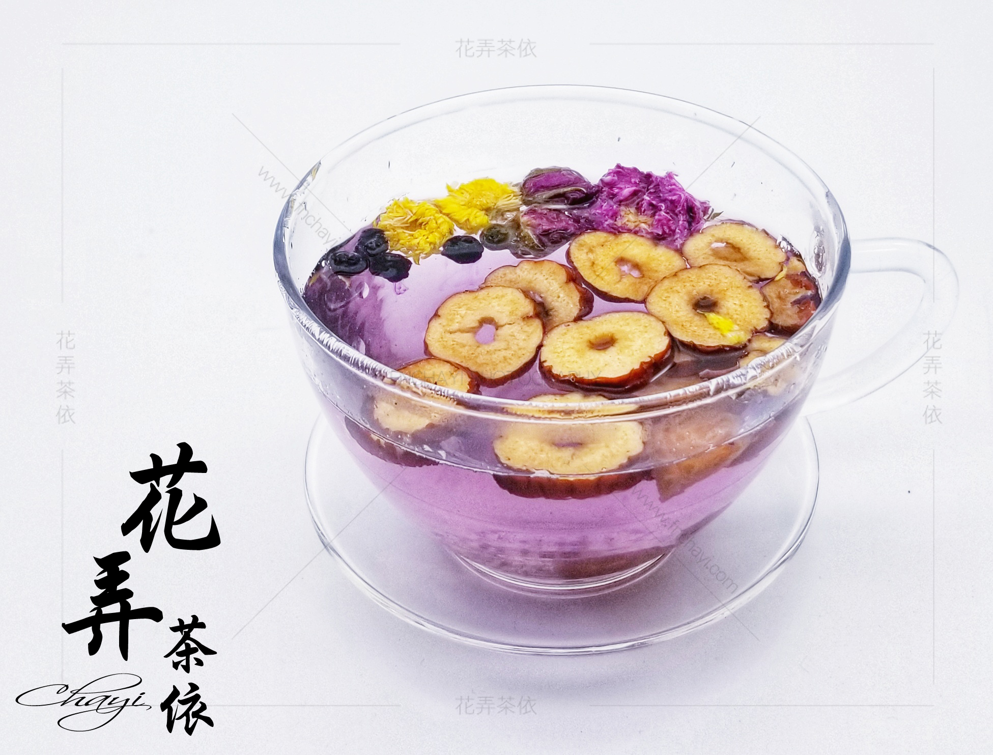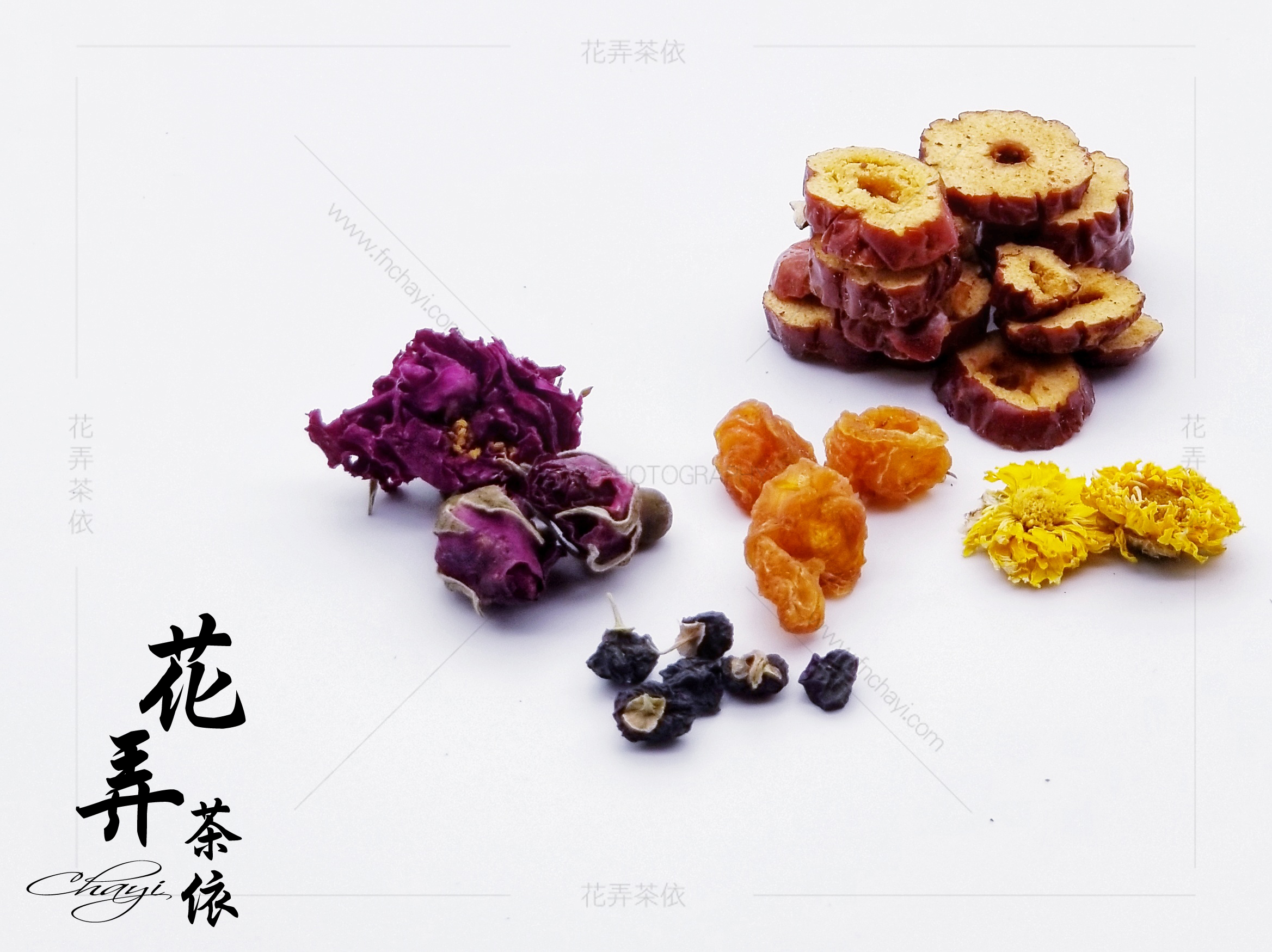 - Ingredients: rose, dark crimson rose, red date, black wolfberry (goji), longan, chrysanthemum buds.