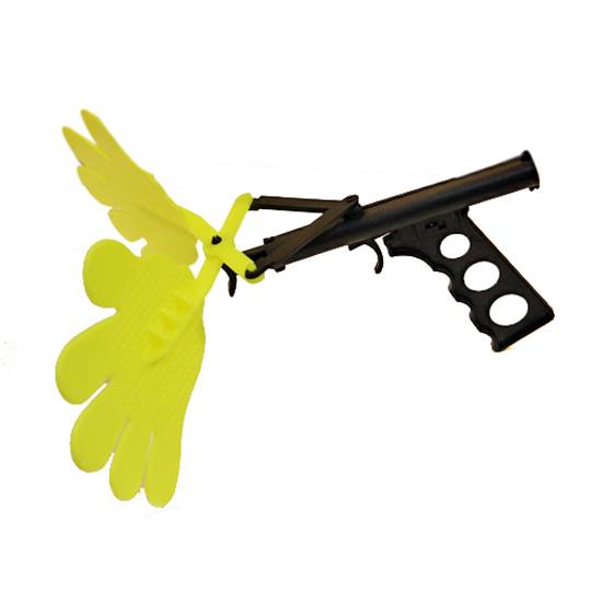 This is a fly catcher or swatter which is made of thin plastic material. It has a gun shape and two hand-shaped plates. When the shooting button is pressed, the hands plates will close and kill the fly.