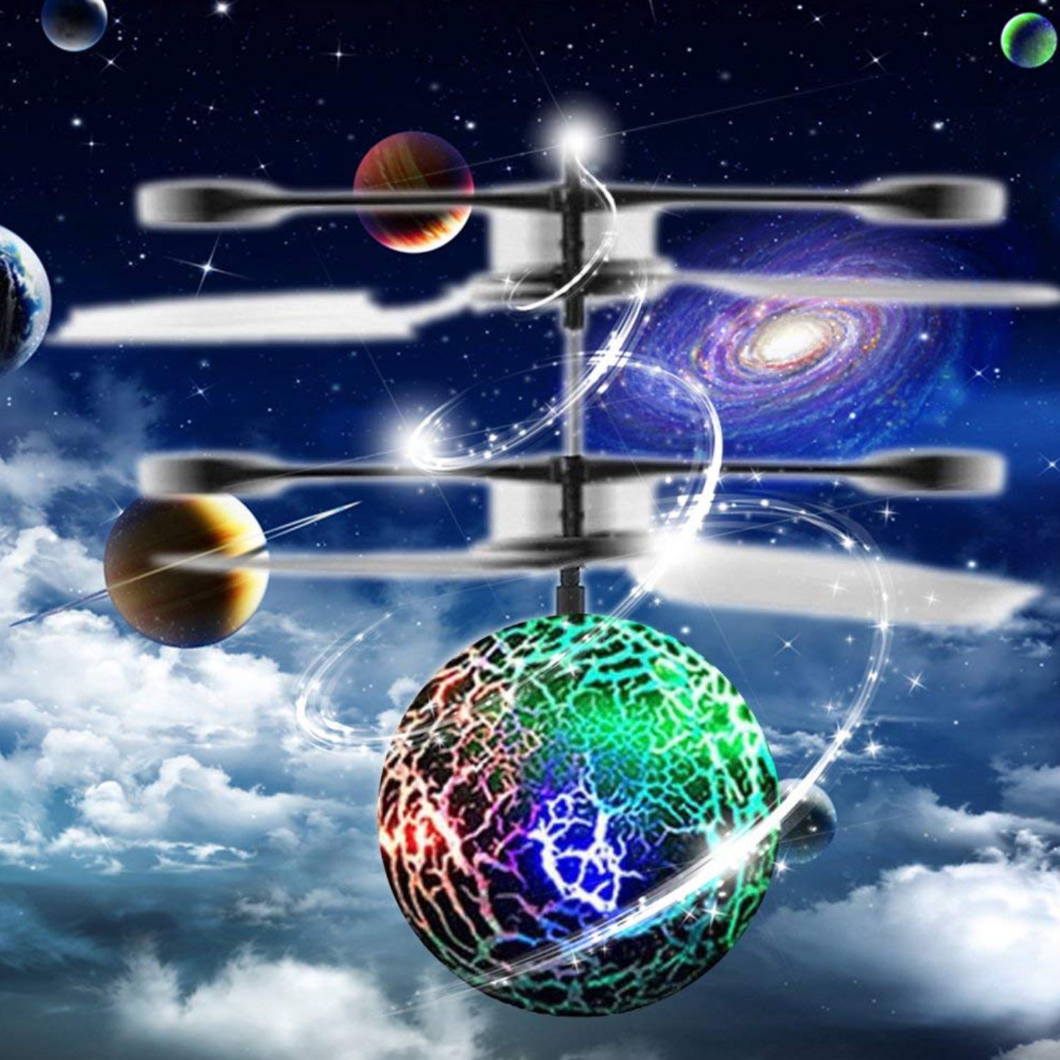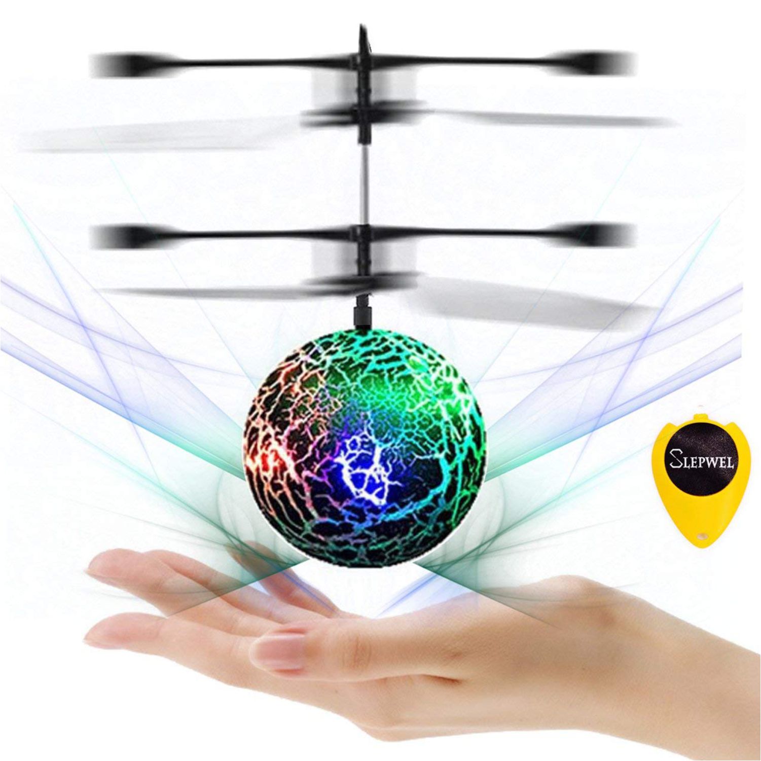 Color change led lights: the ball contains batteries and motors as well as flashing LED lights. When you light the lights flashing up. It has a good visual appeal to any child. Especially at night in a dark room, it looks great. Dazzling colors make flying ball more and more beautiful and colorful like a magnified version of the color snitch.