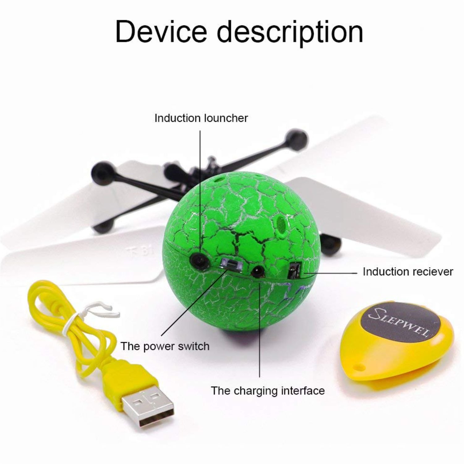 Instruction: at the bottom of the ball, from left to right is induction receiver, charge port, power switch (turn on/off the ball), induction emitter. Using the USB charger to charge the flying ball for 15-20 mins then it could be playing for 6-10 mins. High speed remote controller is included which allows you to turn the ball on/off. Please note it cannot control flying.