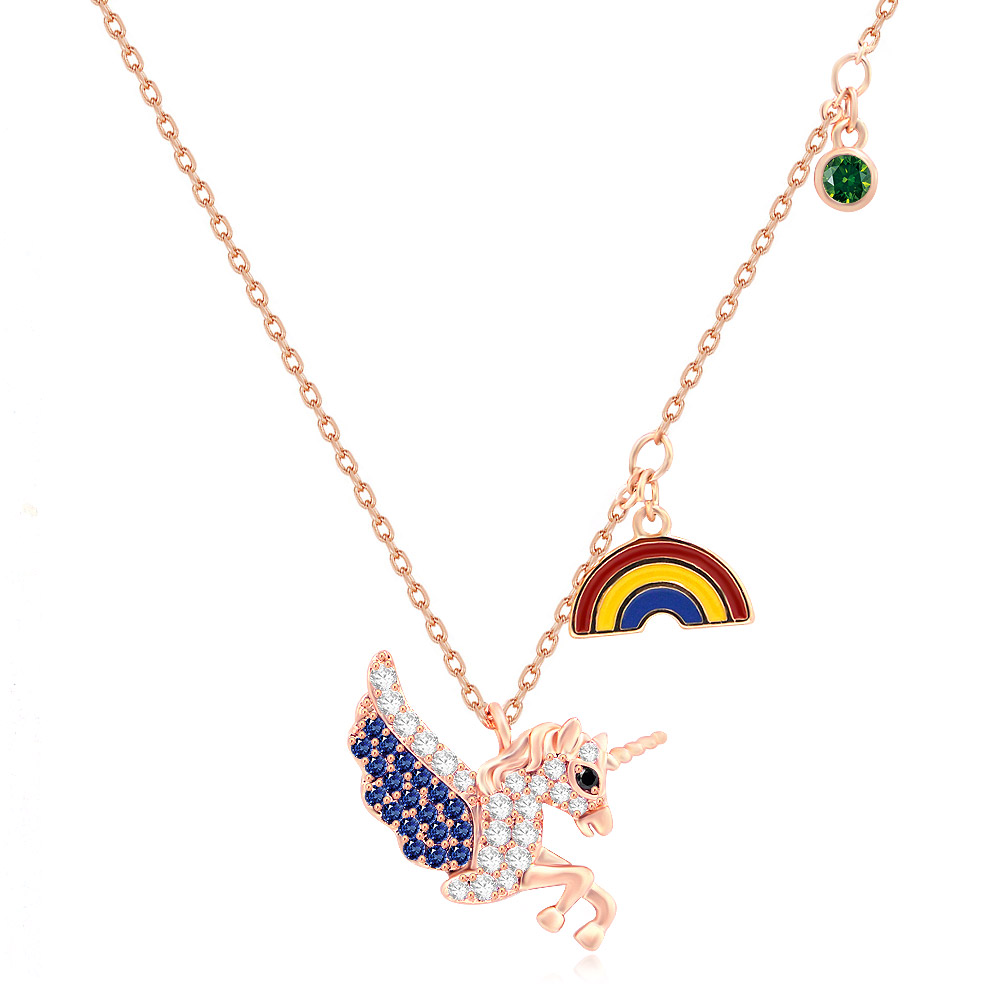 This cute Flying Unicorn Rainbow Necklace is made of high quality rose gold plated.  Dainty and cute. This simple necklace adds a special little something to your look! You are able to choose the length or changing the color for plating or stone.  Please contact us at service@jr-earring.com