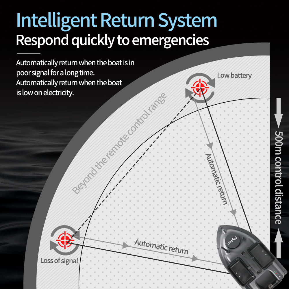 When the boat is low in battery or the signal is poor for a long time, the boat will return automatically