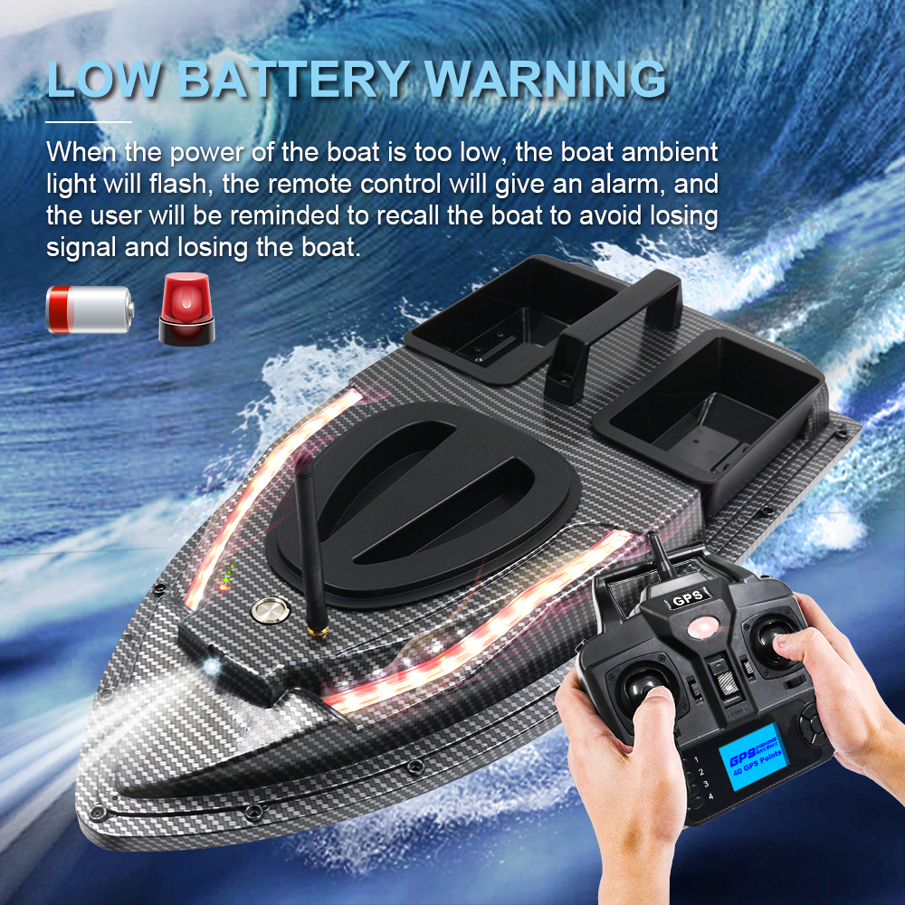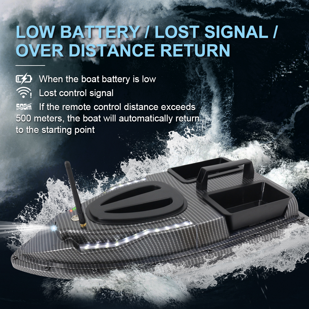 Forward / Backward / Left turn / Right turn / Independently Controlled Double Hoppers / Steering atmosphere light / Fixed speed driving / Bright LED Night Light / 500M Control Distance / 1.5KG Bait Load Capacity / Speed Fine-tuning / LCD Screen Power Display / Low Battery Reminder / Lost Control Reminder / 40 GPS Anchor Points / Auto return if power shortage and poor signal / One-key return / One-key direct access to any positioning point