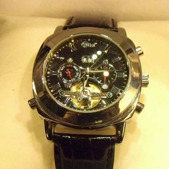 The automatic watch comes with a sleek stainless steel case and leather strap. This flywheel movement accessory comes with an intriguing window to the south, giving you a curious glimpse at the balance wheel. This men's wristwatch is an elegant accessory for any occasion.