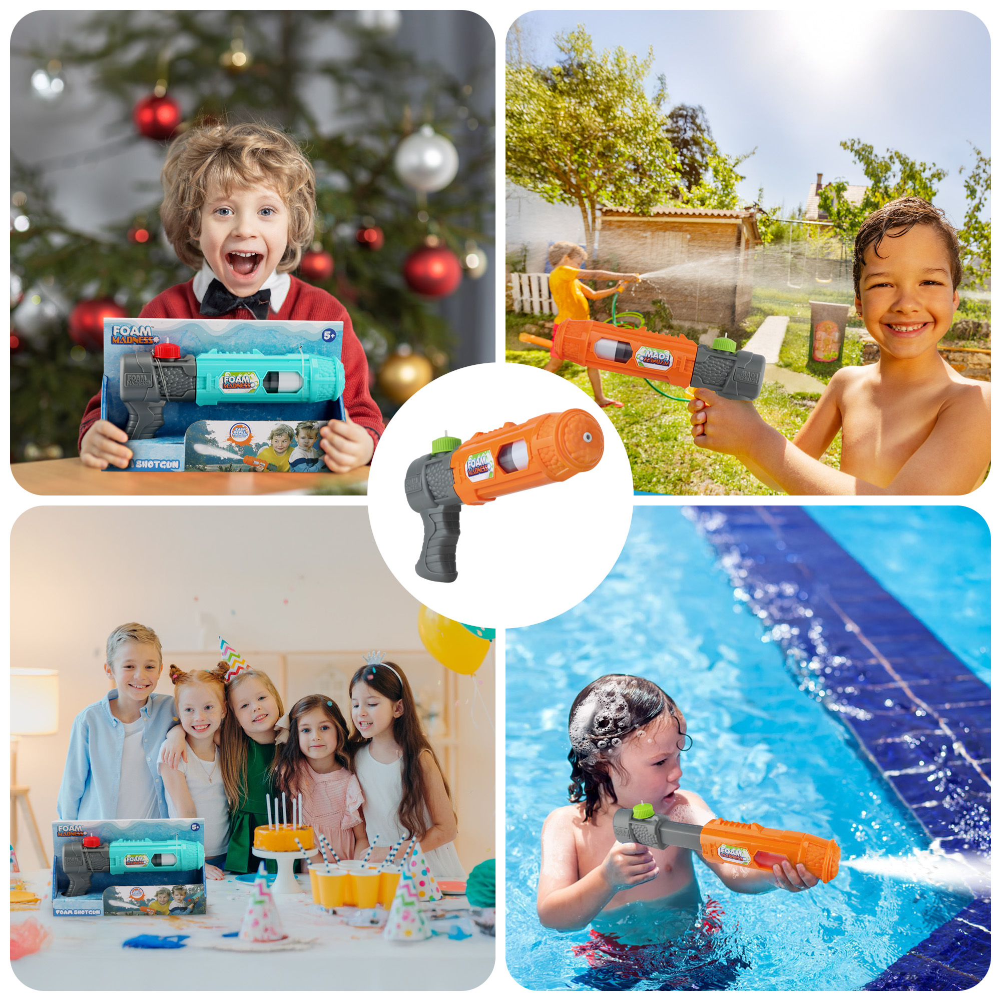 Foam guns are usually designed to fit the curvature of the palm, comfortable to grip, not easy to drop, and are made of environmentally friendly materials that are smooth and burr free and won't cut children's skin. The novel foam design, the amount of foam, let the children enjoy the game and can swim in the dream foam ocean. In the process of playing with the foam gun, the children need to run and dodge, which helps to improve their physical coordination and fitness.