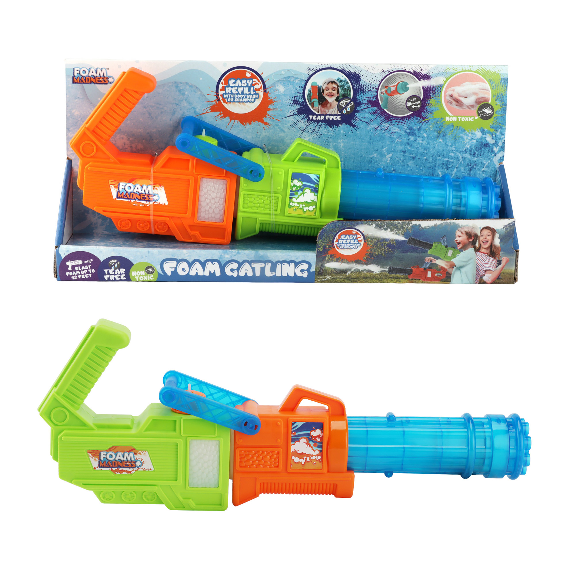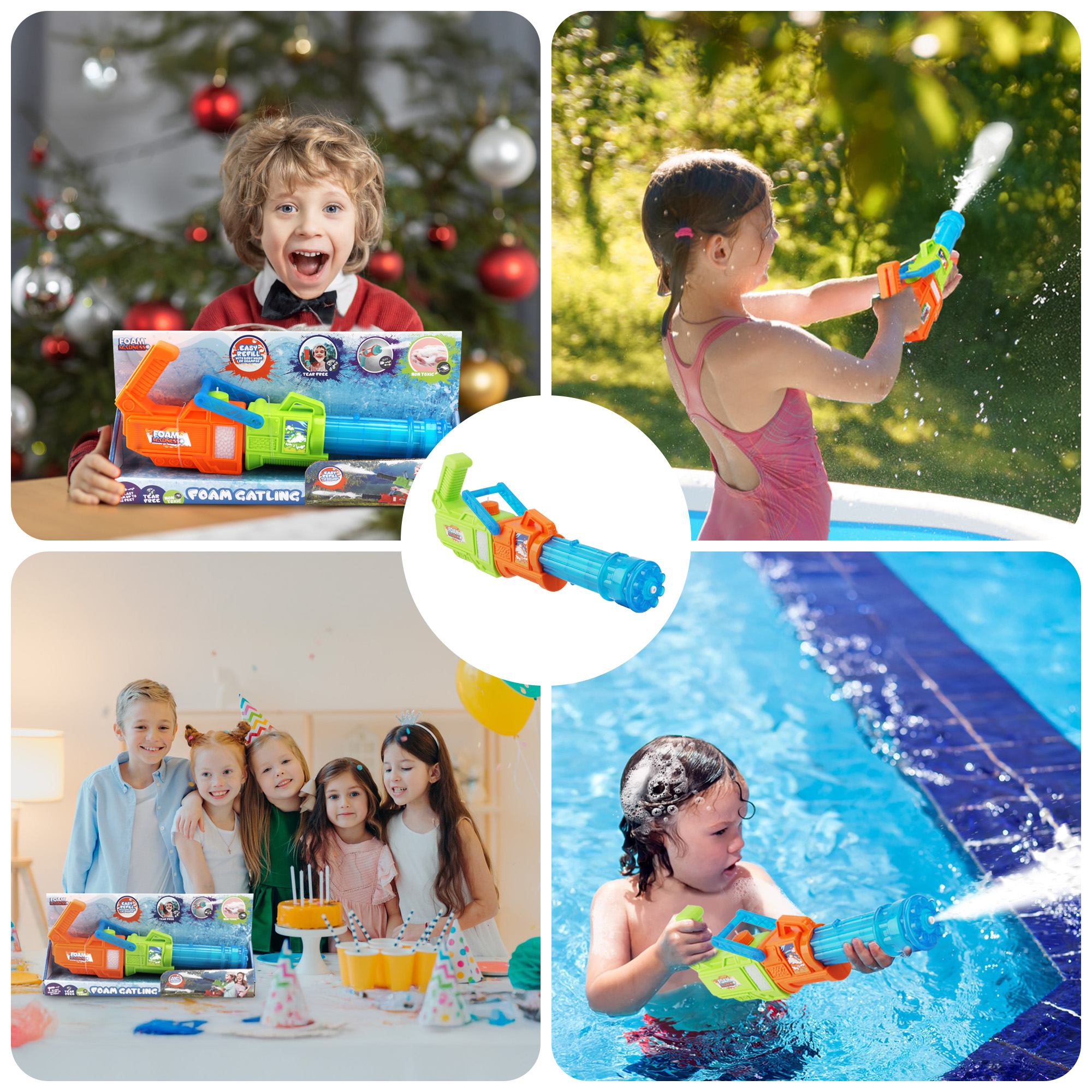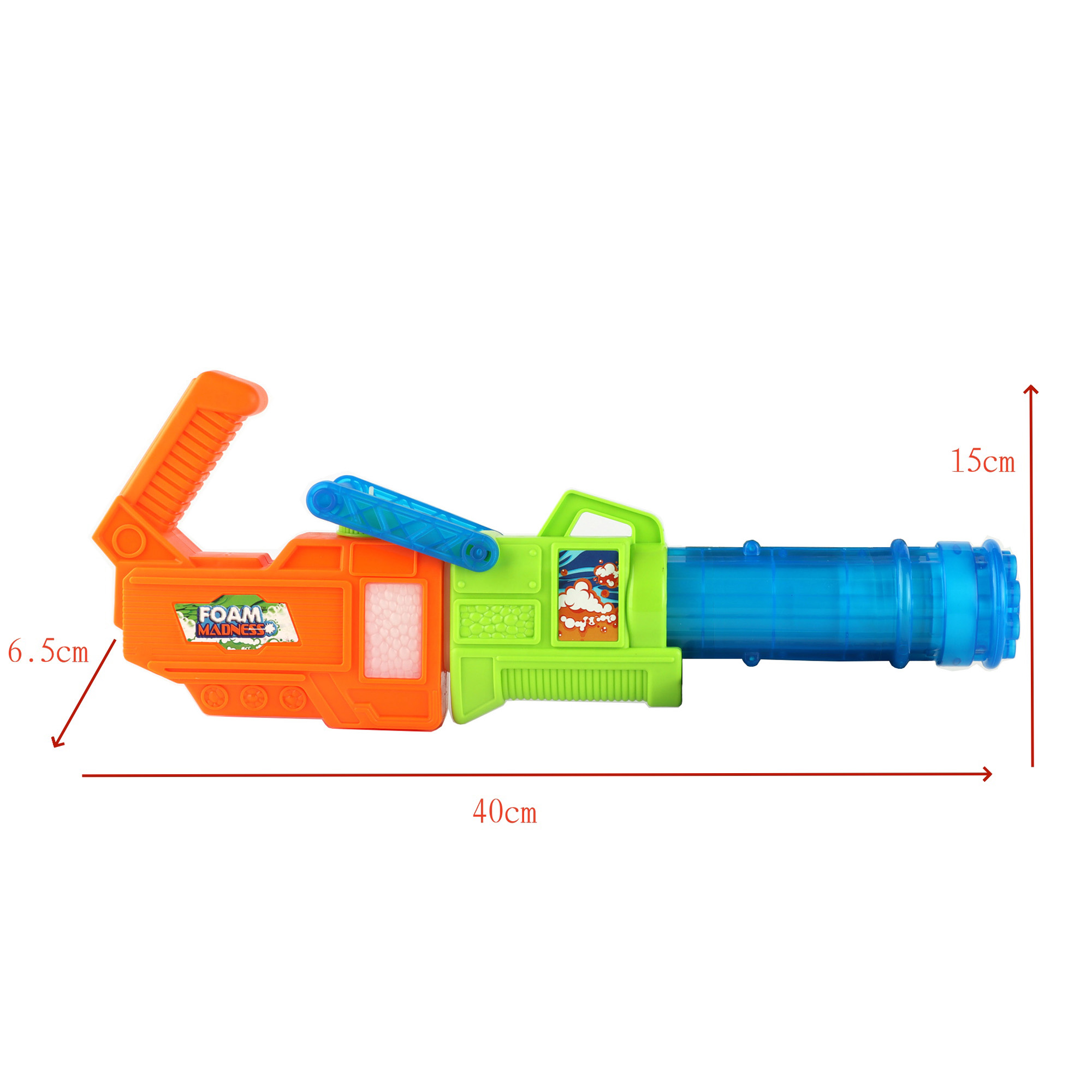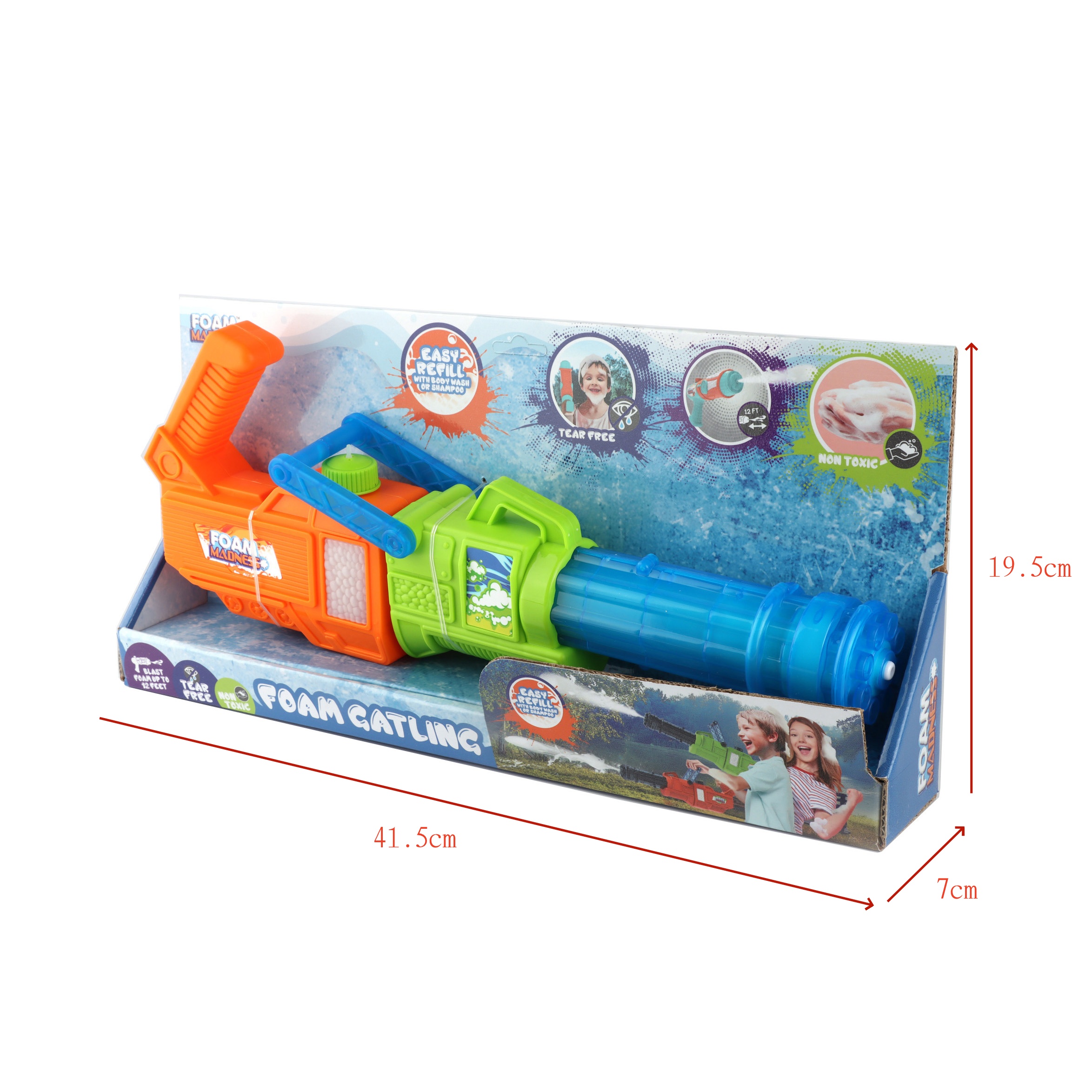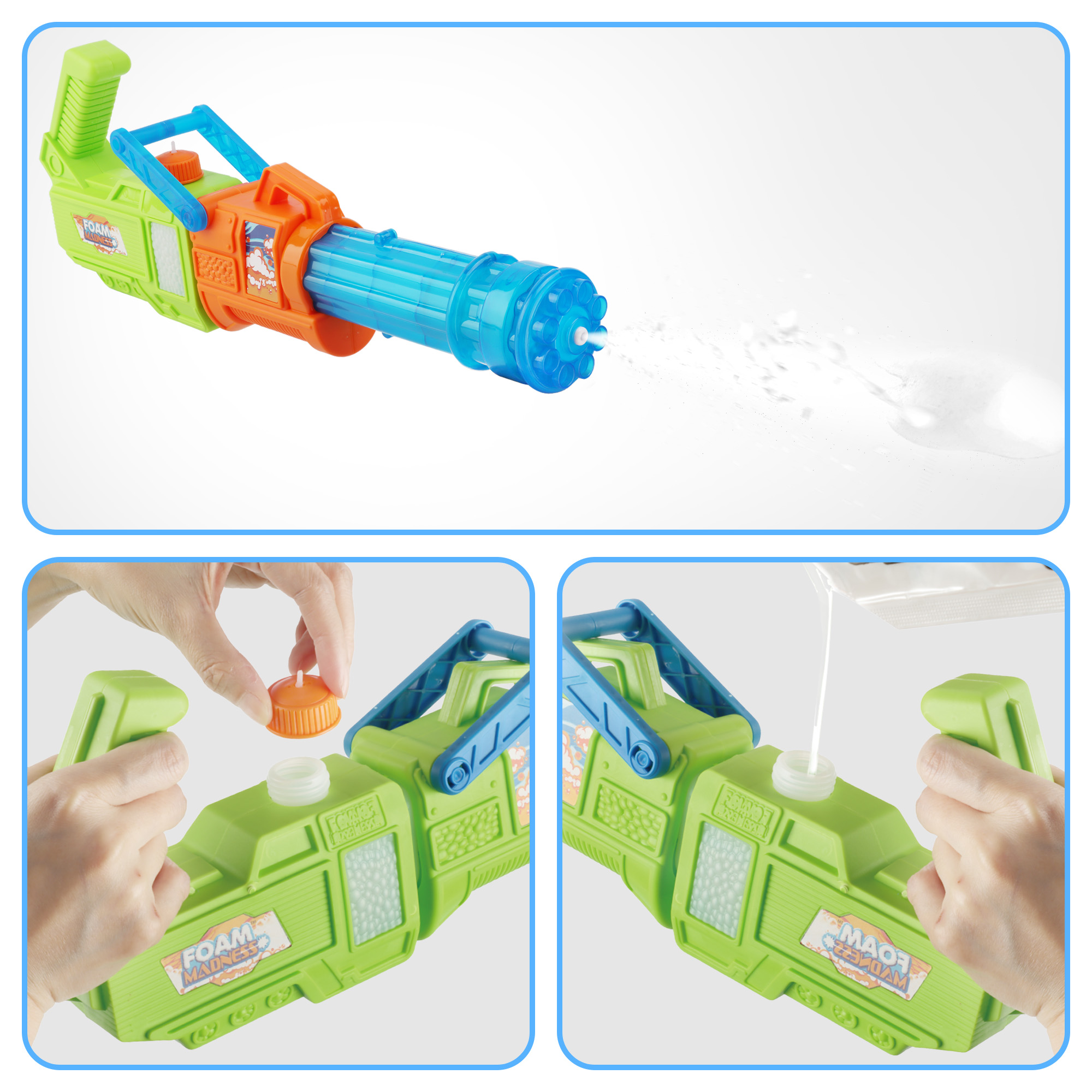 Fun installation process, let children experience the fun of assembly.Easily follow the steps, easy to install, you can start to play.Without batteries, foam can be produced by pulling and pushing. Different pushing and pulling speeds can also adjust the distance of the foam. The foam is safe and non-toxic, the children can have fun and play safely. Foam toy guns are best used outdoors such as parks, gardens, beaches, or other open Spaces. Outdoor use can avoid indoor dirt and slippery, while also giving children more room to run and play.